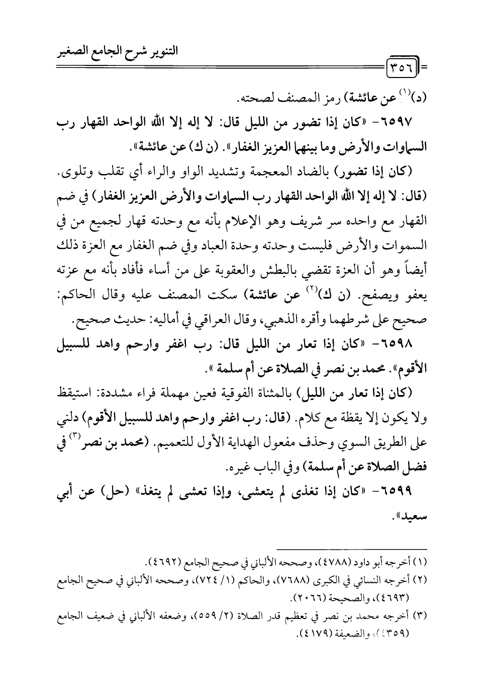 6597 - "كان إذا تضور من الليل قال: لا إله إلا الله الواحد القهار رب السماوات والأرض وما بينهما العزيز الغفار". (ن ك) عن عائشة".