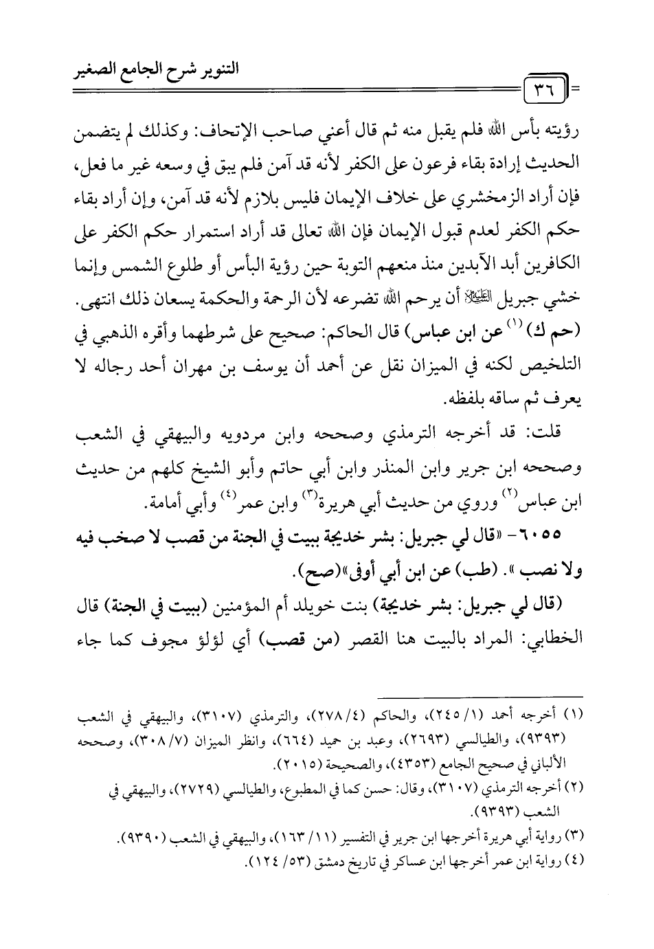 6055 - "قال لي جبريل: بشر خديجة ببيت في الجنة من قصب لا صخب فيه ولا نصب". (طب) عن ابن أبي أوفى" (صح).
