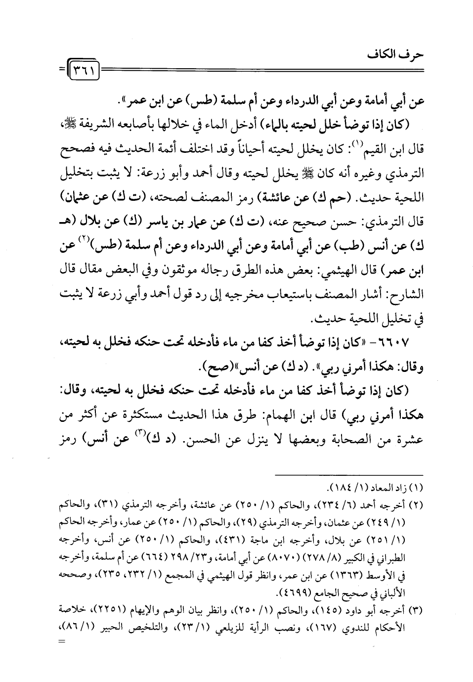 6607 - "كان إذا توضأ أخذ كفا من ماء فأدخله تحت حنكه فخلل به لحيته، وقال: هكذا أمرني ربي". (د ك) عن أنس" (صح).