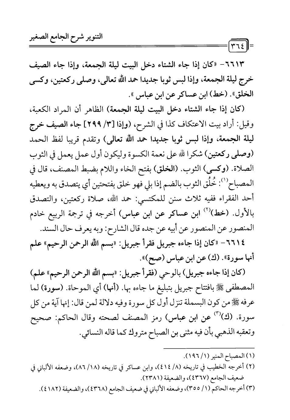 6613 - "كان إذا جاء الشتاء دخل البيت ليلة الجمعة، وإذا جاء الصيف خرج ليلة الجمعة، وإذا لبس ثوبا جديدا حمد الله تعالى، وصلى ركعتين، وكسى الخلق". (خط) ابن عساكر عن ابن عباس".