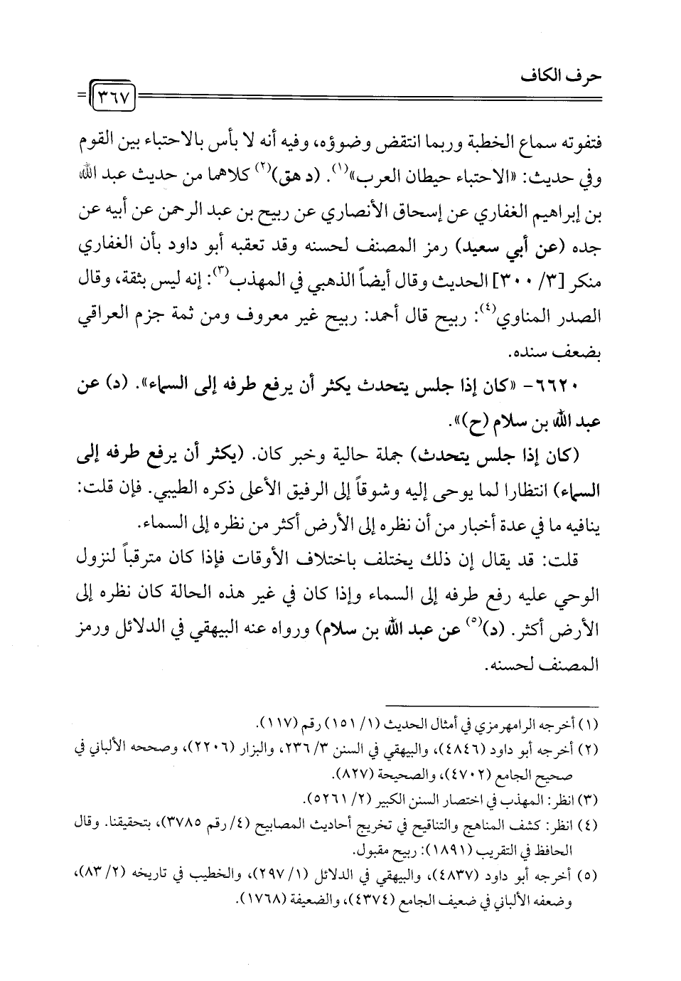 6620 - "كان إذا جلس يتحدث يكثر أن يرفع طرفه إلى السماء". (د) عن عبد الله بن سلام (ح) ".
