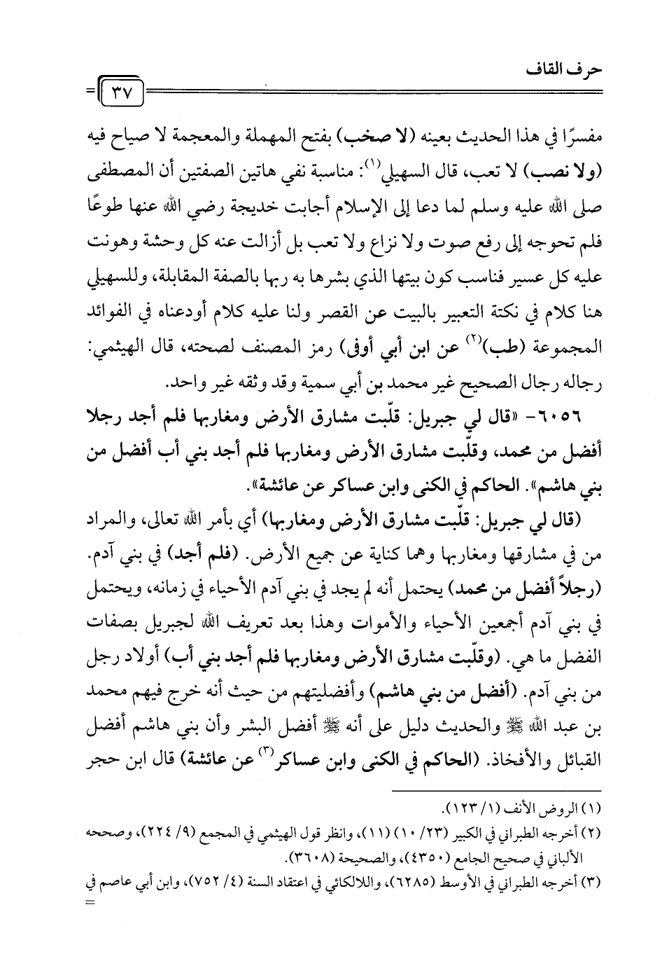 6056 - "قال لي جبريل: قلّبت مشارق الأرض ومغاربها فلم أجد رجلاً أفضل من محمَّد، وقلّبت مشارق الأرض ومغاربها فلم أجد بني أب أفضل من بني هاشم". الحاكم في الكنى وابن عساكر عن عائشة.
