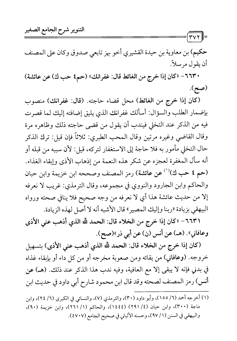 6630 - "كان إذا خرج من الغائط قال: غفرانك" (حم 4 حب ك) عن عائشة) (صح).