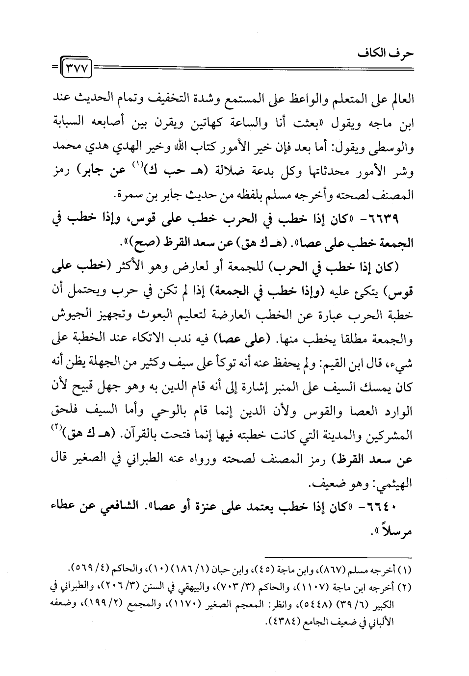 6639 - "كان إذا خطب في الحرب خطب على قوس، وإذا خطب في الجمعة خطب على عصا". (هـ ك هق) عن سعد القرظ (صح) ".