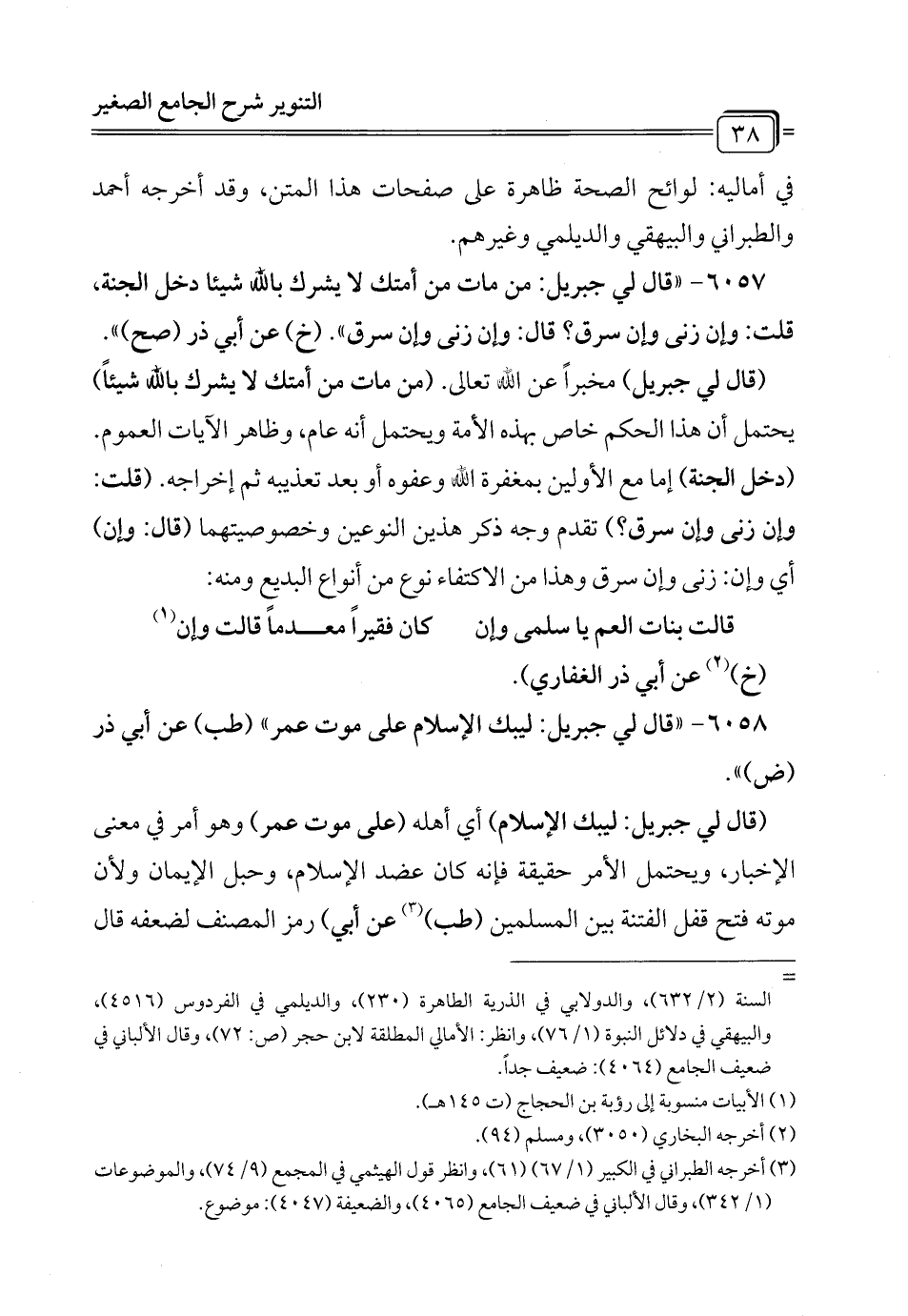 6057 - "قال لي جبريل: من مات من أمتك لا يشرك بالله شيئاً دخل الجنة، قلت: وإن زنى وإن سرق؟ قال: وإن زنى وإن سرق". (خ) عن أبي ذر (صح) ".