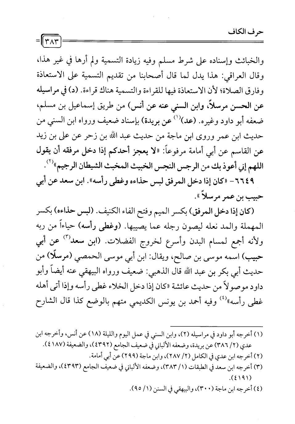 6649 - "كان إذا دخل المرفق لبس حذاءه وغطى رأسه". ابن سعد عن أبي حبيب بن عمر مرسلاً".