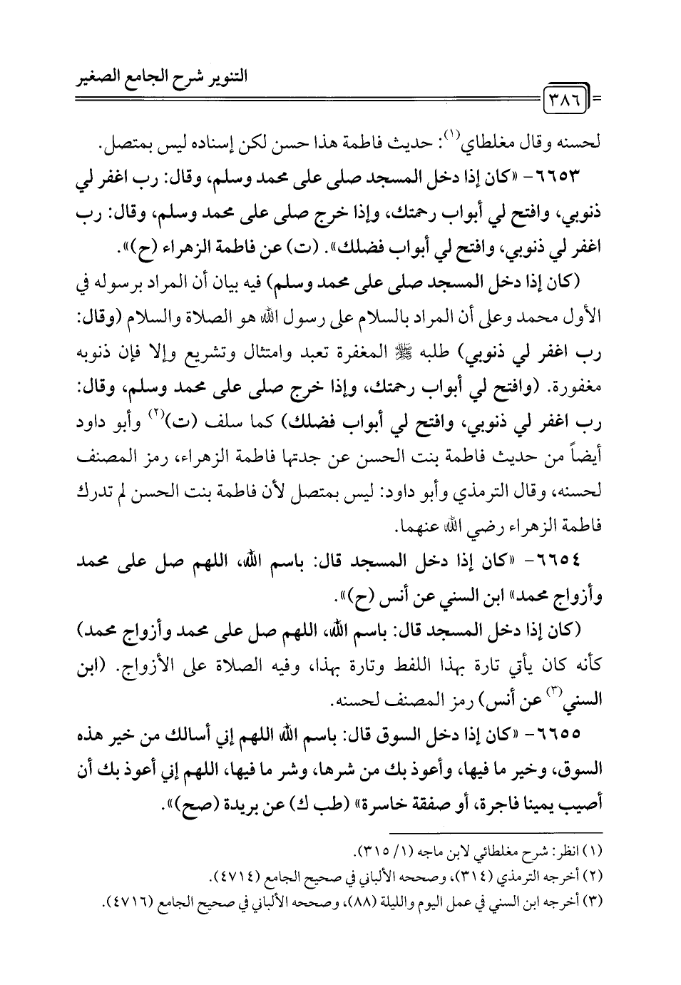 (كان إذا دخل المسجد صلى على محمَّد وسلم) فيه بيان أن المراد برسوله في الأول محمَّد وعلى أن المراد بالسلام على رسول الله هو الصلاة والسلام (وقال: رب اغفر لي ذنوبي) طلبه - صلى الله عليه وسلم - المغفرة تعبد وامتثال وتشريع وإلا فإن ذنوبه مغفورة. (وافتح لي أبواب رحمتك، وإذا خرج صلى على محمَّد وسلم، وقال: رب اغفر لي ذنوبي، وافتح لي أبواب فضلك) كما سلف (ت) (¬2) وأبو داود أيضاً من حديث فاطمة بنت الحسن عن جدتها فاطمة الزهراء، رمز المصنف لحسنه، وقال الترمذي وأبو داود: ليس بمتصل لأن فاطمة بنت الحسن لم تدرك فاطمة الزهراء رضي الله عنهما.