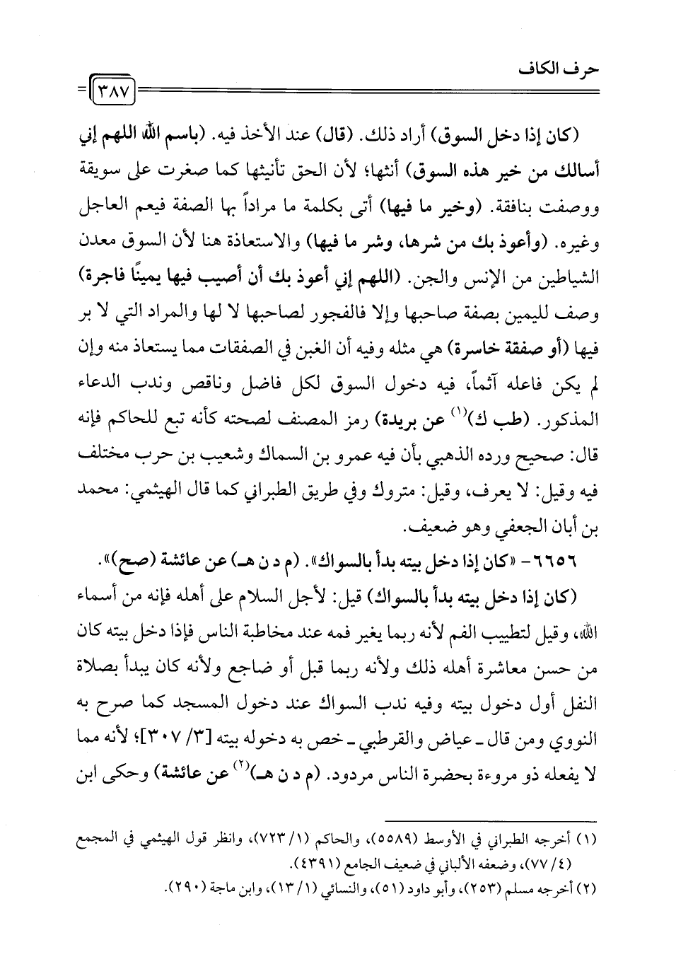 (كان إذا دخل السوق) أراد ذلك. (قال) عند الأخذ فيه. (باسم الله اللهم إني أسألك من خير هذه السوق) أنثها؛ لأن الحق تأنيثها كما صغرت على سويقة ووصفت بنافقة. (وخير ما فيها) أتى بكلمة ما مراداً بها الصفة فيعم العاجل وغيره. (وأعوذ بك من شرها، وشر ما فيها) والاستعاذة هنا لأن السوق معدن الشياطين من الإنس والجن. (اللهم إني أعوذ بك أن أصيب فيها يمينًا فاجرة) وصف لليمين بصفة صاحبها وإلا فالفجور لصاحبها لا لها والمراد التي لا بر فيها (أو صفقة خاسرة) هي مثله وفيه أن الغبن في الصفقات مما يستعاذ منه وإن لم يكن فاعله آثماً، فيه دخول السوق لكل فاضل وناقص وندب الدعاء المذكور. (طب ك) (¬1) عن بريدة) رمز المصنف لصحته كأنه تبع للحاكم فإنه قال: صحيح ورده الذهبي بأن فيه عمرو بن السماك وشعيب بن حرب مختلف فيه وقيل: لا يعرف، وقيل: متروك وفي طريق الطبراني كما قال الهيثمي: محمَّد بن أبان الجعفي وهو ضعيف.
