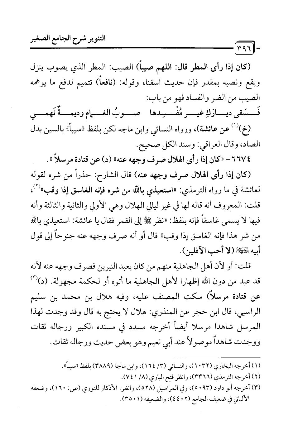 قلت: أو لأن أهل الجاهلية منهم من كان يعبد النيرين فصرف وجهه عنه لأنه قد عبد من دون الله إظهارا لأهل الجاهلية ما أتوه أو لحكمة مجهولة. (د) (¬3) عن قتادة مرسلاً) سكت المصنف عليه، وفيه هلال بن محمَّد بن سليم الراسبي، قال ابن حجر عن المنذري: هلال لا يحتج به قال وقد وجدت لهذا المرسل شاهدا مرسلاً أيضاً أخرجه مسدد في مسنده الكبير ورجاله ثقات ووجدت شاهداً موصولاً عند أبي نعيم وهو بعض حديث ورجاله ثقات.