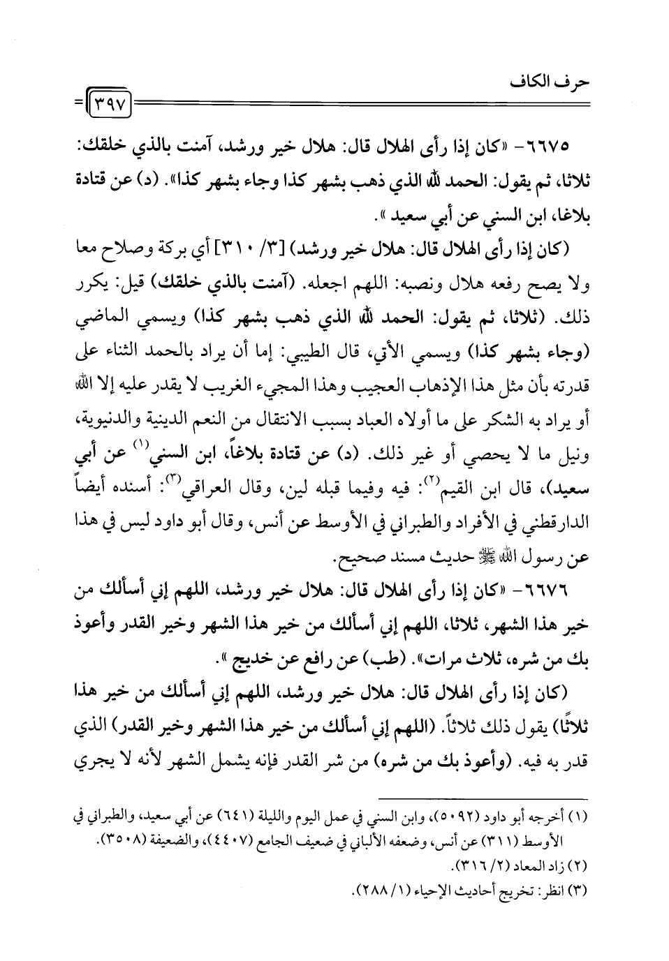 6675 - "كان إذا رأى الهلال قال: هلال خير ورشد، آمنت بالذي خلقك: ثلاثاً، ثم يقول: الحمد لله الذي ذهب بشهر كذا وجاء بشهر كذا". (د) عن قتادة بلاغا، ابن السني عن أبي سعيد".