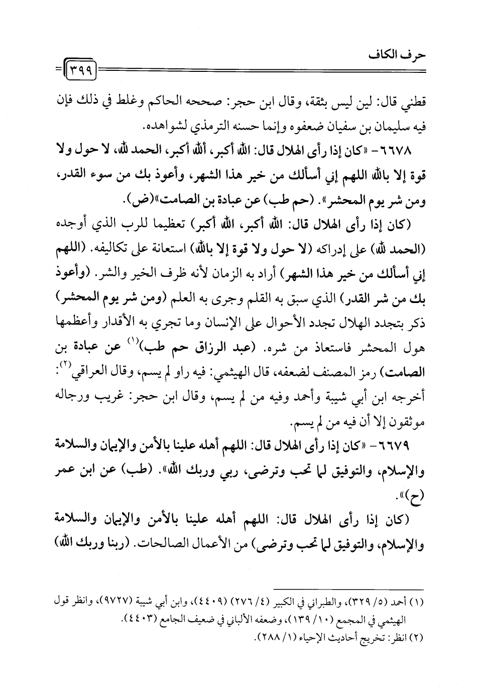 6678 - "كان إذا رأى الهلال قال: الله أكبر، ألله أكبر، الحمد لله، لا حول ولا قوة إلا بالله اللهم إني أسألك من خير هذا الشهر، وأعوذ بك من سوء القدر، ومن شر يوم المحشر". (حم طب) عن عبادة بن الصامت" (ض).