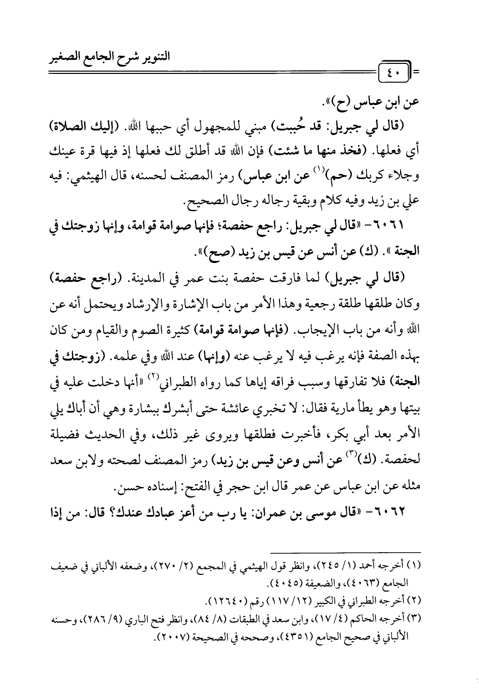 (قال لي جبريل) لما فارقت حفصة بنت عمر في المدينة. (راجع حفصة) وكان طلقها طلقة رجعية وهذا الأمر من باب الإشارة والإرشاد ويحتمل أنه عن الله وأنه من باب الإيجاب. (فإنها صوامة قوامة) كثيرة الصوم والقيام ومن كان بهذه الصفة فإنه يرغب فيه لا يرغب عنه (وإنها) عند الله وفي علمه. (زوجتك في الجنة) فلا تفارقها وسبب فراقه إياها كما رواه الطبراني (¬2) "أنها دخلت عليه في بيتها وهو يطأ مارية فقال: لا تخبري عائشة حتى أبشرك ببشارة وهي أن أباك يلي الأمر بعد أبي بكر، فأخبرت فطلقها ويروى غير ذلك، وفي الحديث فضيلة لحفصة. (ك) (¬3) عن أنس وعن قيس بن زيد) رمز المصنف لصحته ولابن سعد مثله عن ابن عباس عن عمر قال ابن حجر في الفتح: إسناده حسن.