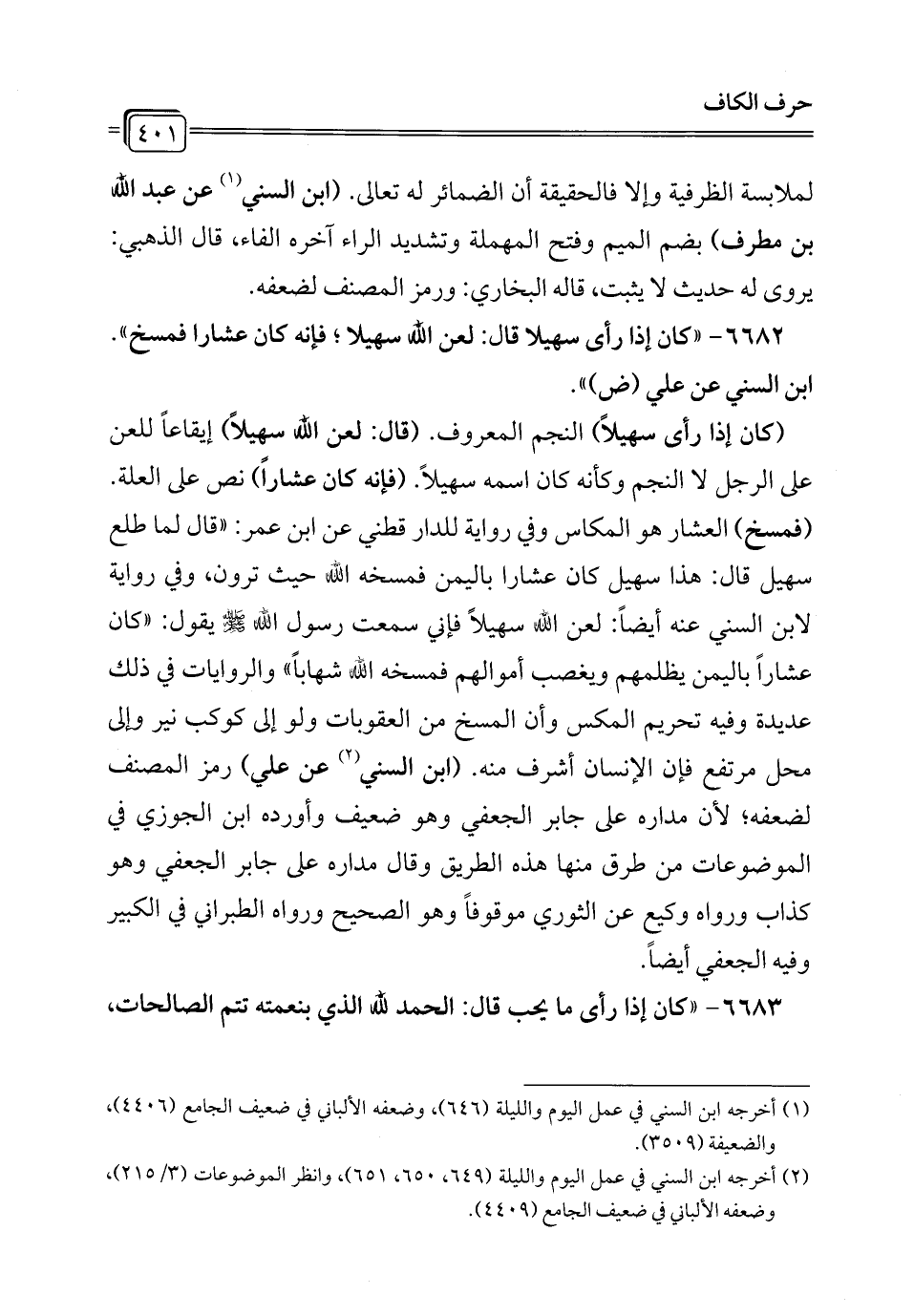 (كان إذا رأى سهيلاً) النجم المعروف. (قال: لعن الله سهيلاً) إيقاعاً للعن على الرجل لا النجم وكأنه كان اسمه سهيلاً. (فإنه كان عشاراً) نص على العلة. (فمسخ) العشار هو المكاس وفي رواية للدارقطني عن ابن عمر: "قال لما طلع سهيل قال: هذا سهيل كان عشارا باليمن فمسخه الله حيث ترون، وفي رواية لابن السني عنه أيضاً: لعن الله سهيلاً فإني سمعت رسول الله - صلى الله عليه وسلم - يقول: "كان عشاراً باليمن يظلمهم ويغصب أموالهم فمسخه الله شهاباً" والروايات في ذلك عديدة وفيه تحريم المكس وأن المسخ من العقوبات ولو إلى كوكب نير وإلى محل مرتفع فإن الإنسان أشرف منه. (ابن السني (¬2) عن علي) رمز المصنف لضعفه؛ لأن مداره على جابر الجعفي وهو ضعيف وأورده ابن الجوزي في الموضوعات من طرق منها هذه الطريق وقال مداره على جابر الجعفي وهو كذاب ورواه وكيع عن الثوري موقوفاً وهو الصحيح ورواه الطبراني في الكبير وفيه الجعفي أيضاً.