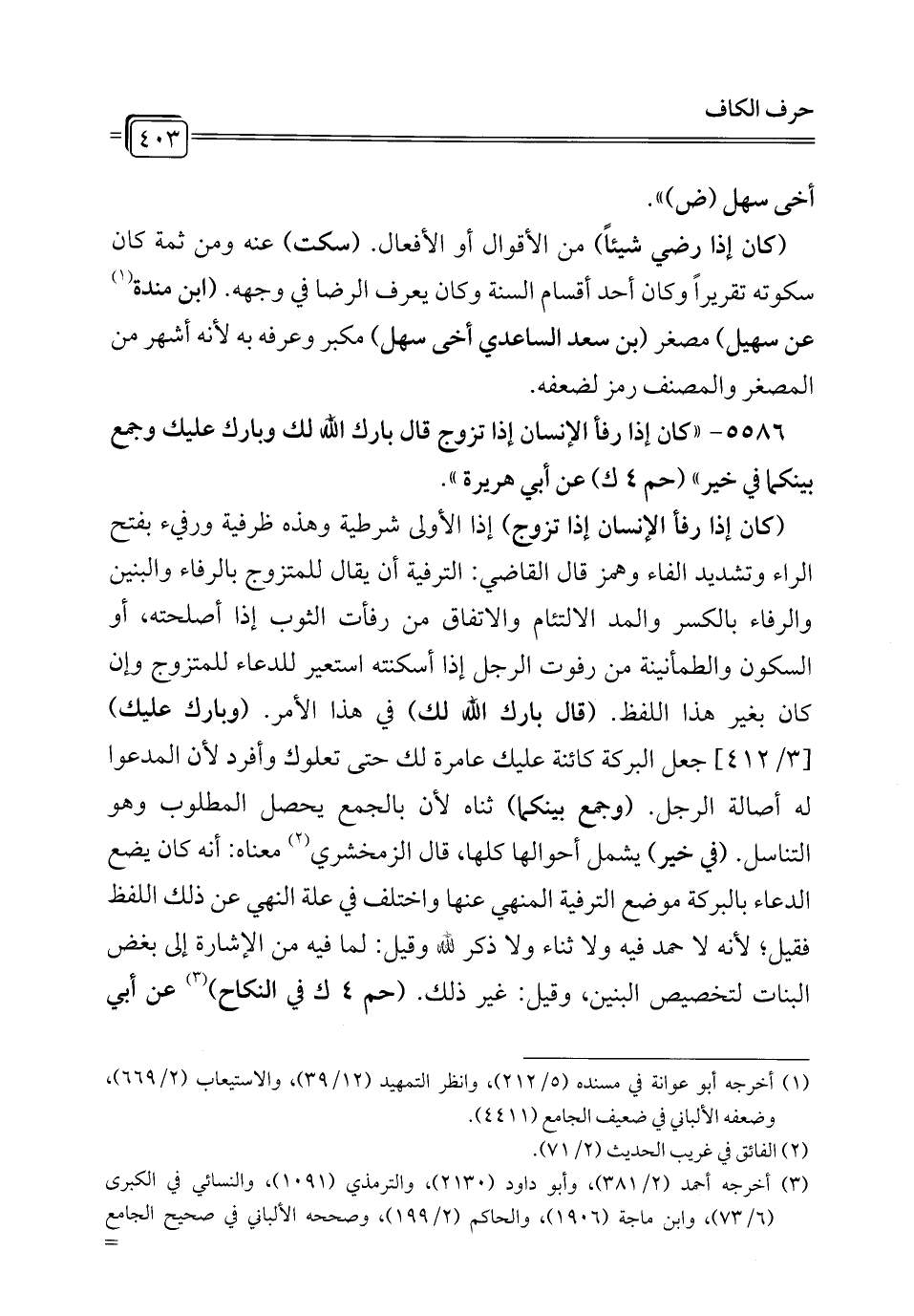 5586 - "كان إذا رفأ الإنسان إذا تزوج قال بارك الله لك وبارك عليك وجمع بينكما في خير" (حم 4 ك) عن أبي هريرة".