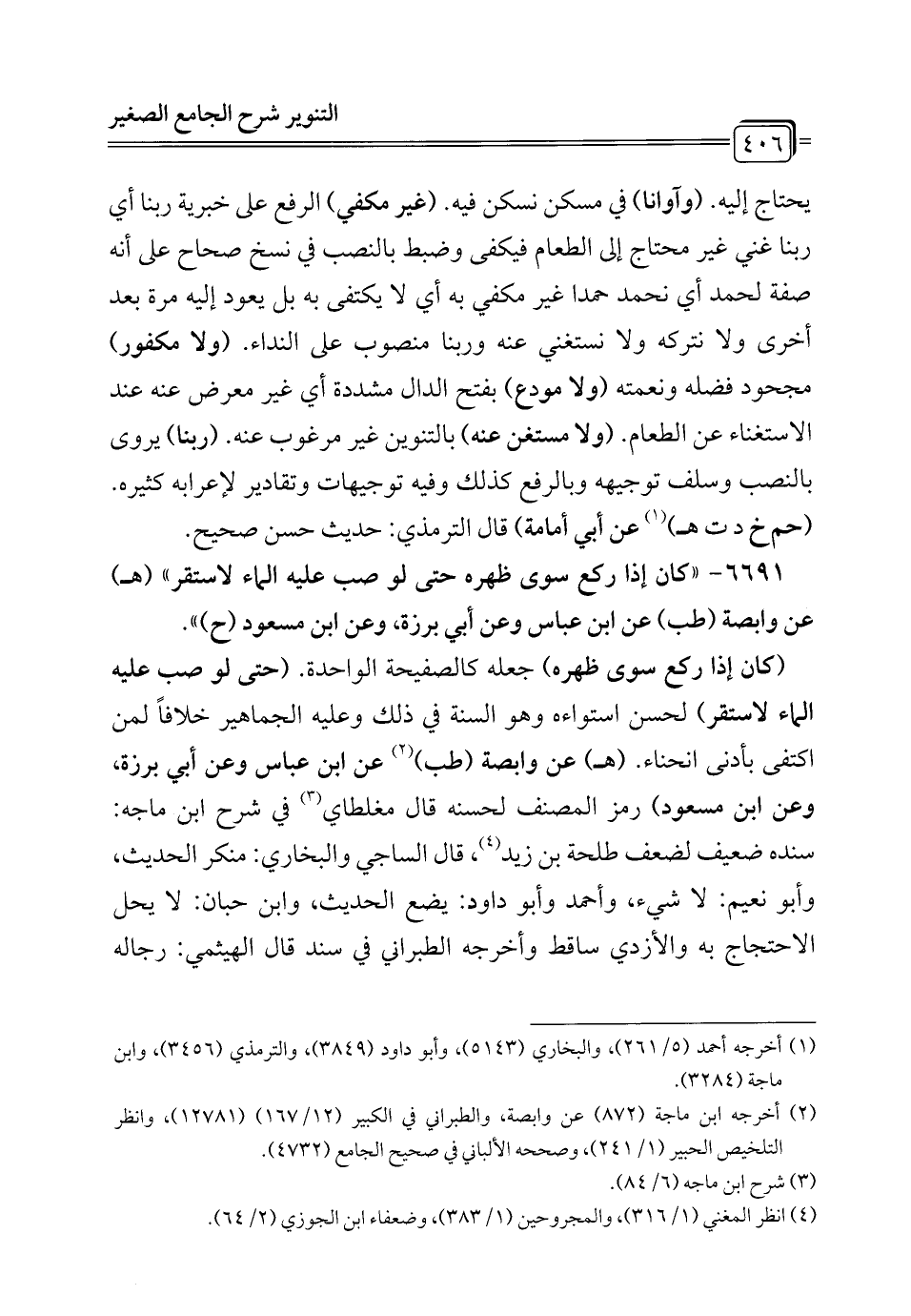يحتاج إليه. (وآوانا) في مسكن نسكن فيه. (غير مكفي) الرفع على خبرية ربنا أي ربنا غني غير محتاج إلى الطعام فيكفى وضبط بالنصب في نسخ صحاح على أنه صفة لحمد أي نحمد حمدا غير مكفي به أي لا يكتفى به بل يعود إليه مرة بعد أخرى ولا نتركه ولا نستغني عنه وربنا منصوب على النداء. (ولا مكفور) مجحود فضله ونعمته (ولا مودع) بفتح الدال مشددة أي غير معرض عنه عند الاستغناء عن الطعام. (ولا مستغن عنه) بالتنوين غير مرغوب عنه. (ربنا) يروى بالنصب وسلف توجيهه وبالرفع كذلك وفيه توجيهات وتقادير لإعرابه كثيره. (حم خ د ت هـ) (¬1) عن أبي أمامة) قال الترمذي: حديث حسن صحيح.