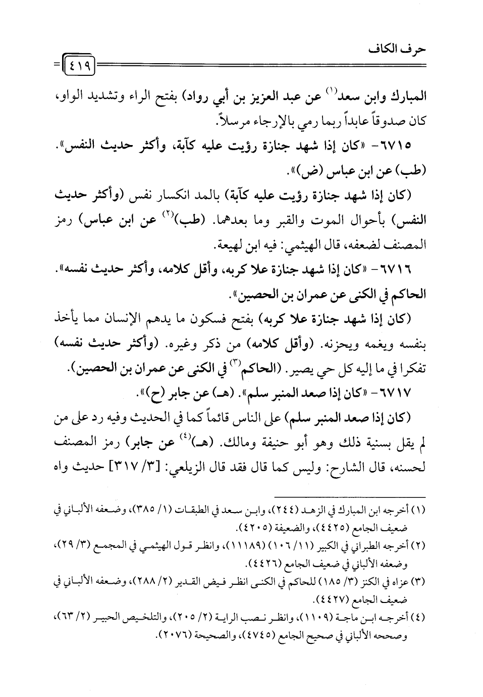6716 - "كان إذا شهد جنازة علا كربه، وأقل كلامه، وأكثر حديث نفسه". الحاكم في الكنى عن عمران بن الحصين".