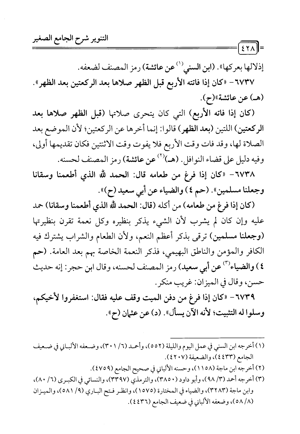 6737 - "كان إذا فاتته الأربع قبل الظهر صلاها بعد الركعتين بعد الظهر". (هـ) عن عائشة" (ح).