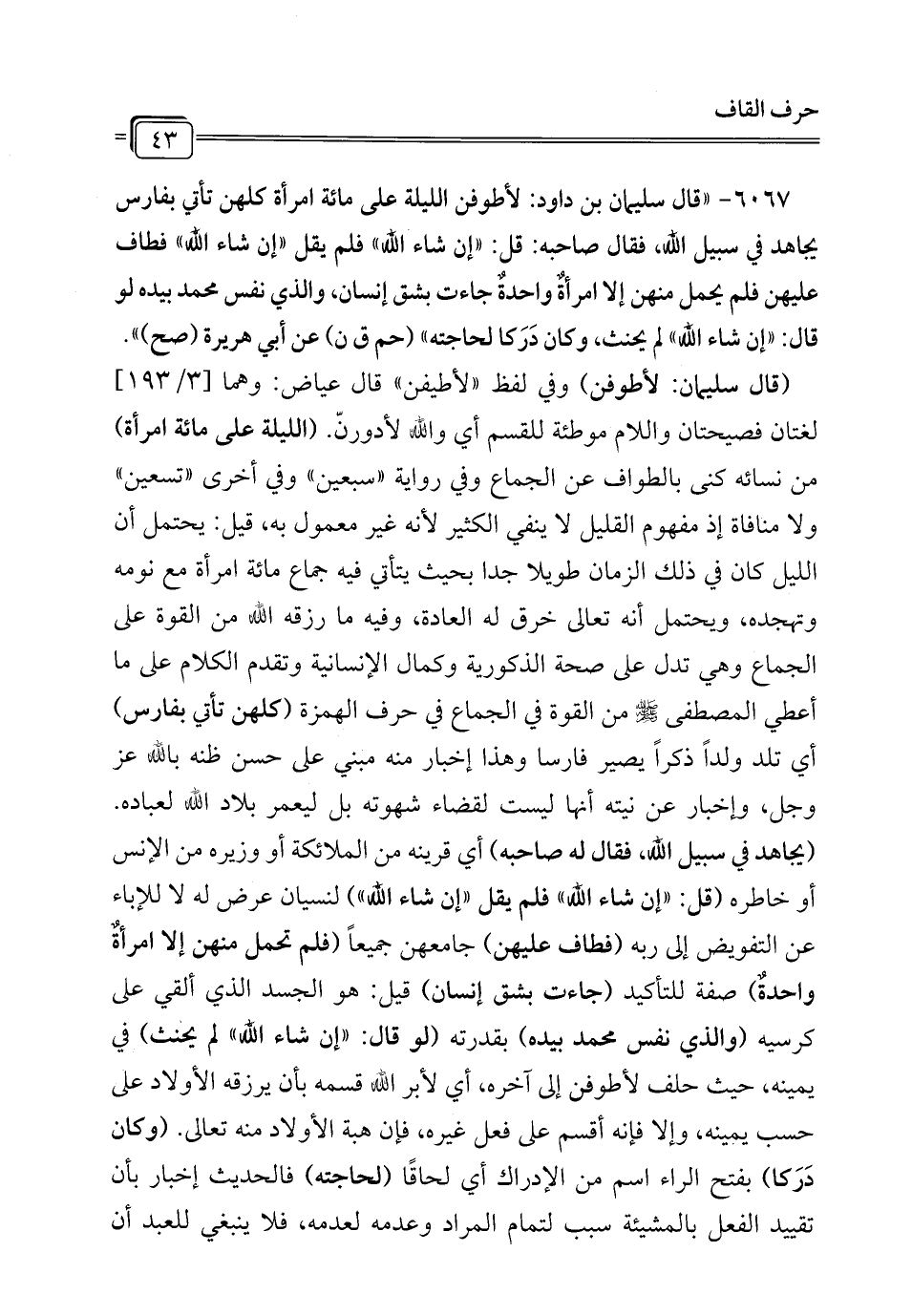 (قال سليمان: لأطوفن) وفي لفظ "لأطيفن" قال عياض: وهما [3/ 193] لغتان فصيحتان واللام موطئة للقسم أي الله لأدورنّ. (الليلة على مائة امرأة) من نسائه كنى بالطواف عن الجماع وفي رواية "سبعين" وفي أخرى "تسعين" ولا منافاة إذ مفهوم القليل لا ينفي الكثير لأنه غير معمول به، قيل: يحتمل أن الليل كان في ذلك الزمان طويلاً جداً بحيث يتأتي فيه جماع مائة امرأة مع نومه وتهجده، ويحتمل أنه تعالى خرق له العادة، وفيه ما رزقه الله من القوة على الجماع وهي تدل على صحة الذكورية وكمال الإنسانية وتقدم الكلام على ما أعطي المصطفى - صلى الله عليه وسلم - من القوة في الجماع في حرف الهمزة (كلهن تأتي بفارس) أي تلد ولداً ذكراً يصير فارسا وهذا إخبار منه مبني على حسن ظنه بالله عز وجل، وإخبار عن نيته أنها ليست لقضاء شهوته بل ليعمر بلاد الله لعباده. (يجاهد في سبيل الله، فقال له صاحبه) أي قرينه من الملائكة أو وزيره من الإنس أو خاطره (قل: "إن شاء الله" فلم يقل "إن شاء الله") لنسيان عرض له لا للإباء عن التفويض إلى ربه (فطاف عليهن) جامعهن جميعاً (فلم تحمل منهن إلا امرأةٌ واحدةٌ) صفة للتأكيد (جاءت بشق إنسان) قيل: هو الجسد الذي ألقي على كرسيه (والذي نفس محمَّد بيده) بقدرته (لو قال: "إن شاء الله" لم يحنث) في يمينه، حيث حلف لأطوفن إلى آخره، أي لأبر الله قسمه بأن يرزقه الأولاد على حسب يمينه، وإلا فإنه أقسم على فعل غيره، فإن هبة الأولاد منه تعالى. (وكان دَرَكا) بفتح الراء اسم من الإدراك أي لحاقًا (لحاجته) فالحديث إخبار بأن تقييد الفعل بالمشيئة سبب لتمام المراد وعدمه لعدمه، فلا ينبغي للعبد أن