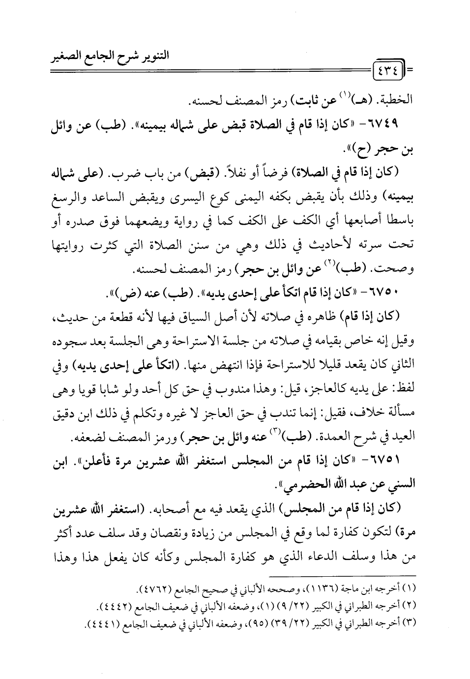 6749 - "كان إذا قام في الصلاة قبض على شماله بيمينه". (طب) عن وائل بن حجر (ح) ".
