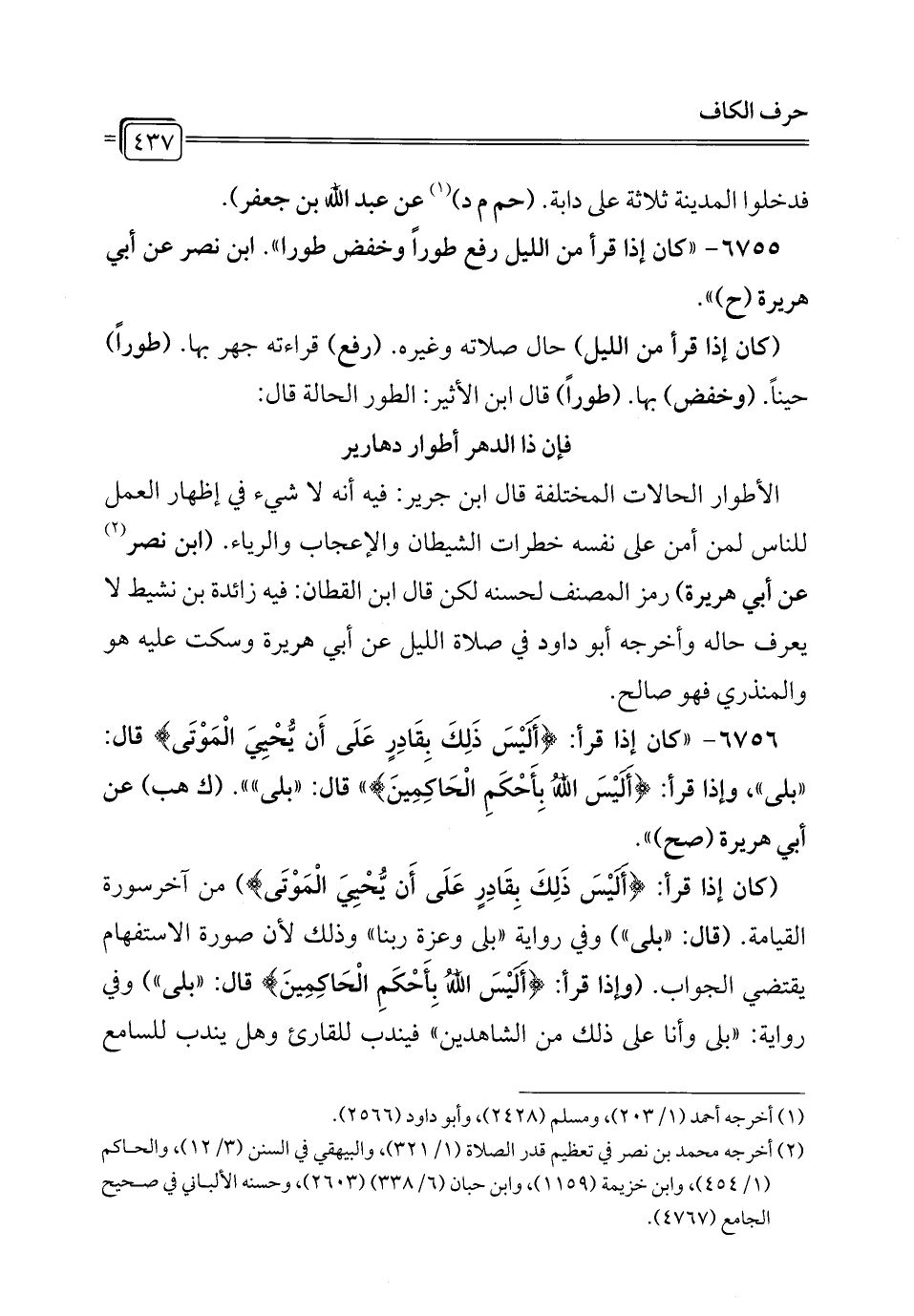 6755 - "كان إذا قرأ من الليل رفع طورًا وخفض طورا". ابن نصر عن أبي هريرة (ح) ".