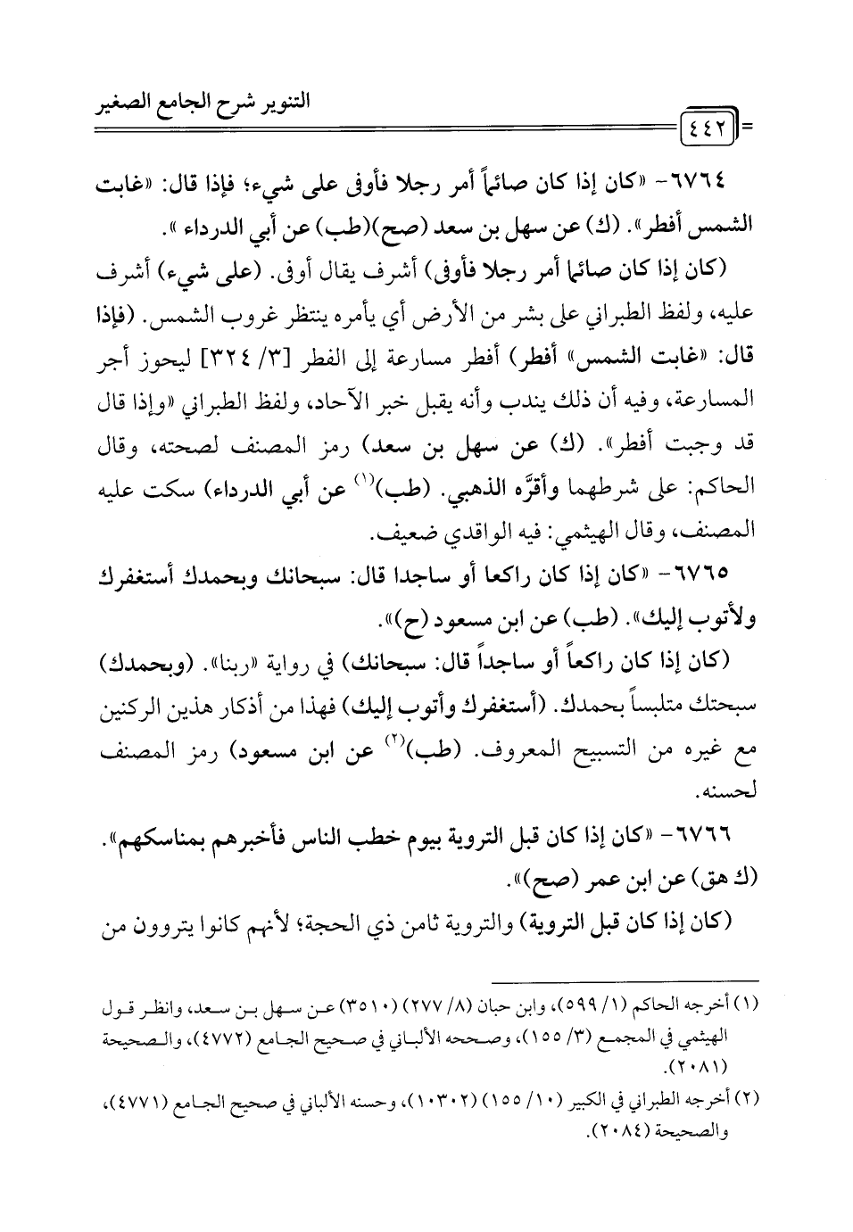 6764 - "كان إذا كان صائماً أمر رجلاً فأوفى على شيء؛ فإذا قال: "غابت الشمس أفطر". (ك) عن سهل بن سعد (صح) (طب) عن أبي الدرداء".