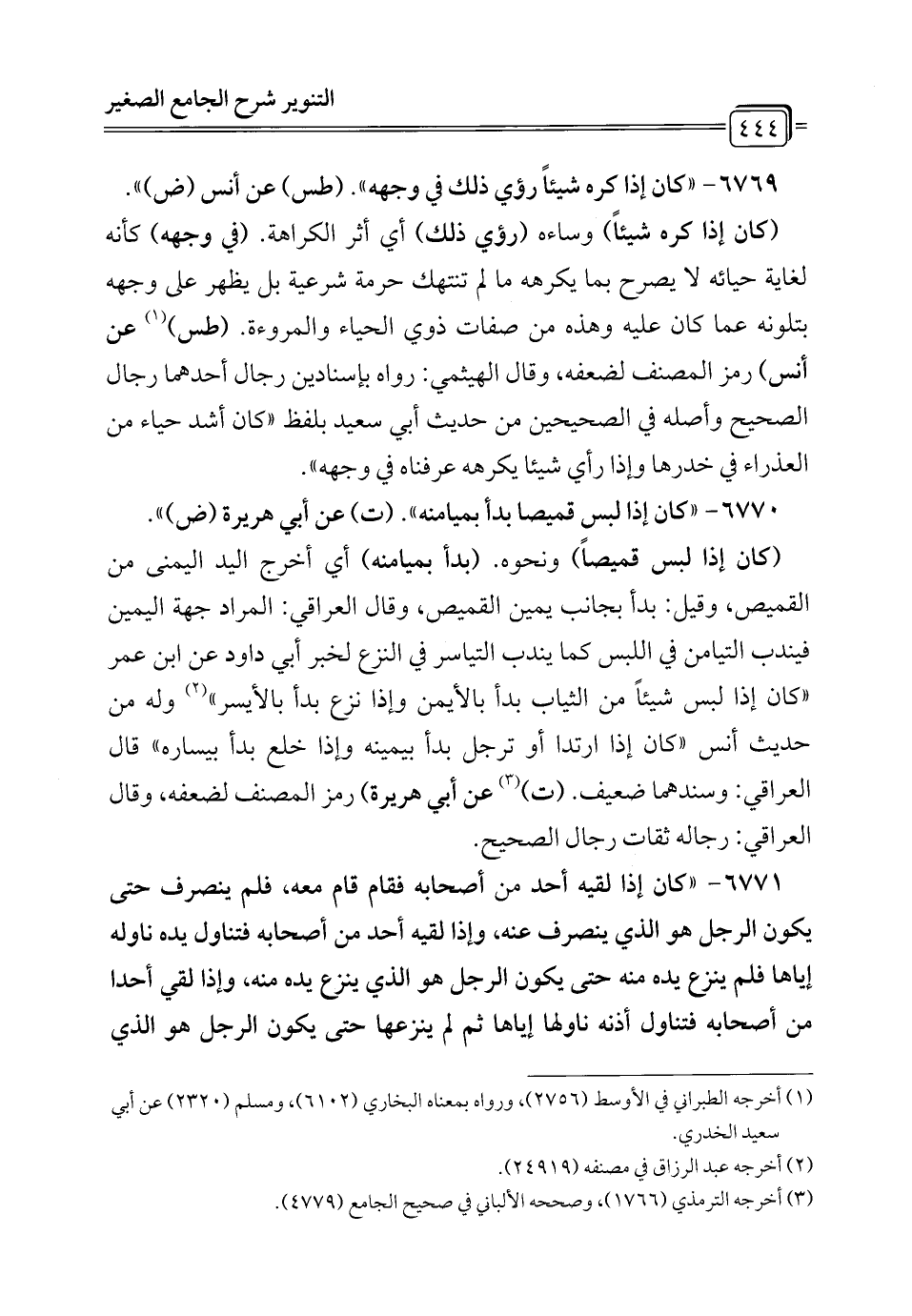 6770 - "كان إذا لبس قميصا بدأ بميامنه". (ت) عن أبي هريرة (ض) ".