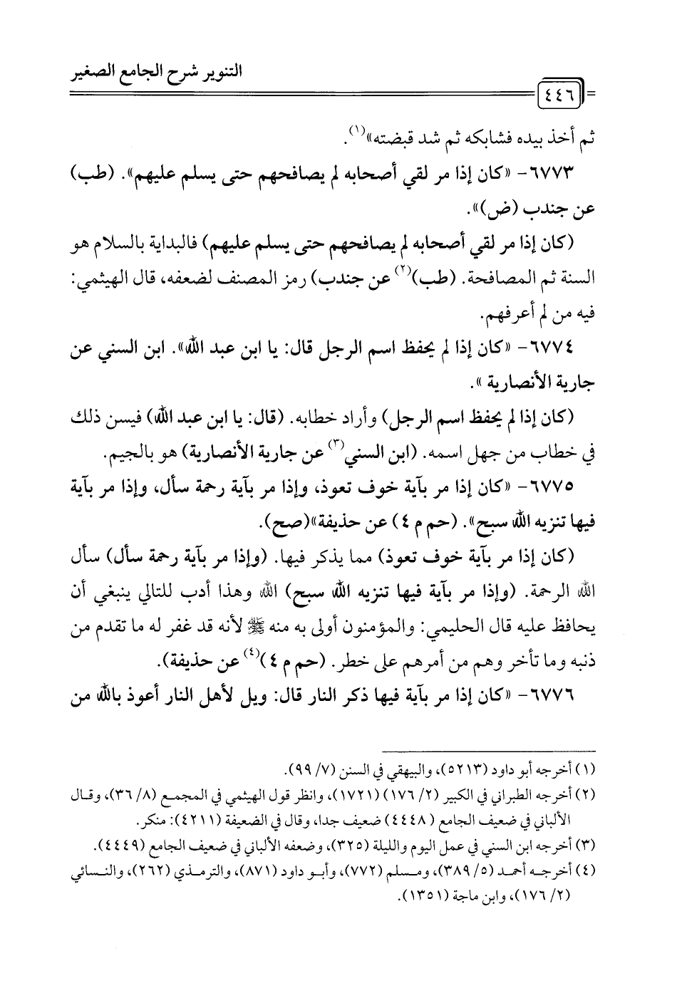 6773 - "كان إذا مر لقي أصحابه لم يصافحهم حتى يسلم عليهم". (طب) عن جندب (ض) ".