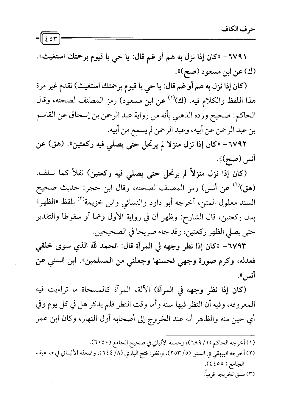 6793 - "كان إذا نظر وجهه في المرآة قال: الحمد لله الذي سوى خلقي فعدله، وكرم صورة وجهي فحسنها وجعلني من المسلمين". ابن السني عن أنس".