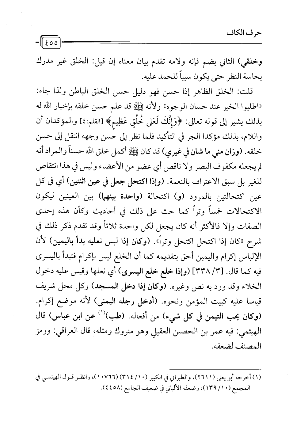 قلت: الخلق الظاهر إذا حسن فهو دليل حسن الخلق الباطن ولذا جاء: "اطلبوا الخير عند حسان الوجوه" ولأنه - صلى الله عليه وسلم - قد علم حسن خلقه بإخبار الله له بذلك يشير إلى قوله تعالى: {وَإِنَّكَ لَعَلَى خُلُقٍ عَظِيمٍ} [القلم: 4] والمؤكدان أن واللام، بذلك مؤكدا الجر في التأكيد فلما نظر إلى حسن وجهه انتقل إلى حسن خلقه. (وزان مني ما شأن في غيري) قد كان - صلى الله عليه وسلم - أكمل خلق الله حسناً والمراد أنه لم يجعله مكفوف البصر ولا ناقص أي عضو من الأعضاء وليس في هذا انتقاص للغير بل سبق الاعتراف بالنعمة. (وإذا اكتحل جعل في عين اثنتين) أي في كل عين اكتحالتين بالمرود (و) اكتحالة (واحدة بينهما) بين العينين ليكون الاكتحالات خمساً وتراً كما حث على ذلك في أحاديث وكأن هذه إحدى الصفات وإلا فالأكثر أنه كان يجعل لكل واحدة ثلاثاً وقد تقدم ذكر ذلك في شرح "كان إذا اكتحل اكتحل وتراً". (وكان إذا لبس نعليه بدأ باليمين) لأن الإلباس إكرام واليمين أحق بتقديمه كما أن الخلع ليس بإكرام فتبدأ باليسرى فيه كما قال. [3/ 338] (وإذا خلع خلع اليسرى) أي نعلها وقيس عليه دخول الخلاء وقد ورد به نص وغيره. (وكان إذا دخل المسجد) وكل محل شريف قياسا عليه كبيت المؤمن ونحوه. (أدخل رجله اليمنى) لأنه موضع إكرام. (وكان يحب التيمن في كل شيء) من أفعاله. (طب) (¬1) عن ابن عباس) قال الهيثمي: فيه عمر بن الحصين العقيلي وهو متروك ومثله، قال العراقي: ورمز المصنف لضعفه.