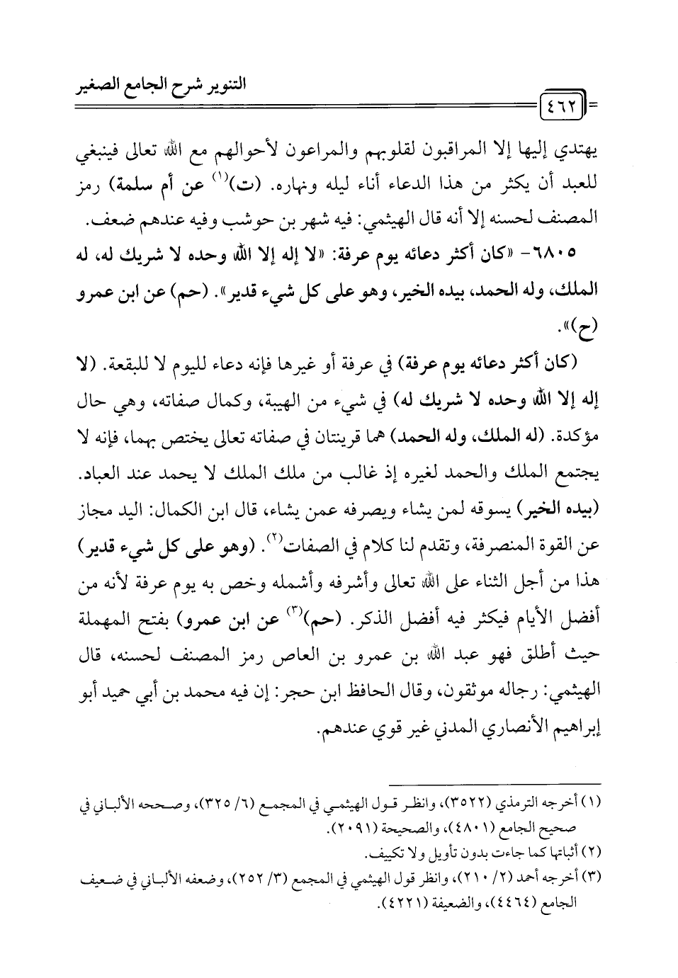 (كان أكثر دعائه يوم عرفة) في عرفة أو غيرها فإنه دعاء لليوم لا للبقعة. (لا إله إلا الله وحده لا شريك له) في شيء من الهيبة، وكمال صفاته، وهي حال مؤكدة. (له الملك، وله الحمد) هما قرينتان في صفاته تعالى يختص بهما، فإنه لا يجتمع الملك والحمد لغيره إذ غالب من ملك الملك لا يحمد عند العباد. (بيده الخير) يسوقه لمن يشاء ويصرفه عمن يشاء، قال ابن الكمال: اليد مجاز عن القوة المنصرفة، وتقدم لنا كلام في الصفات (¬2). (وهو على كل شيء قدير) هذا من أجل الثناء على الله تعالى وأشرفه وأشمله وخص به يوم عرفة لأنه من أفضل الأيام فيكثر فيه أفضل الذكر. (حم) (¬3) عن ابن عمرو) بفتح المهملة حيث أطلق فهو عبد الله بن عمرو بن العاص رمز المصنف لحسنه، قال الهيثمي: رجاله موثقون، وقال الحافظ ابن حجر: إن فيه محمَّد بن أبي حميد أبو إبراهيم الأنصاري المدني غير قوي عندهم.