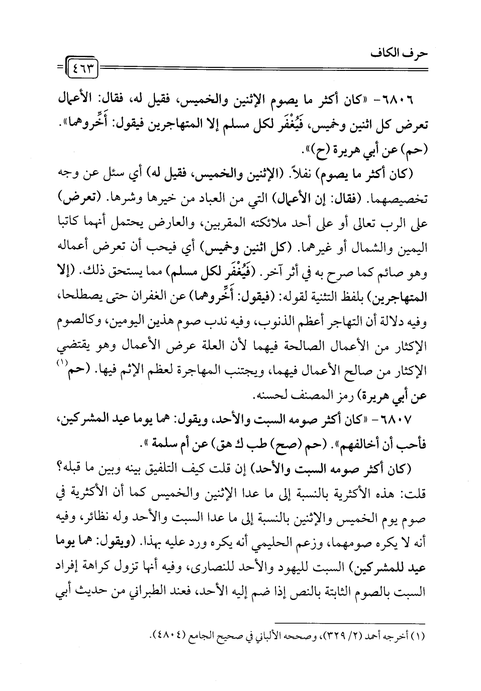 6806 - "كان أكثر ما يصوم الإثنين والخميس، فقيل له، فقال: الأعمال تعرض كل اثنين وخميس، فَيُغْفَر لكل مسلم إلا المتهاجرين فيقول: أَخِّروهما". (حم) عن أبي هريرة (ح) ".