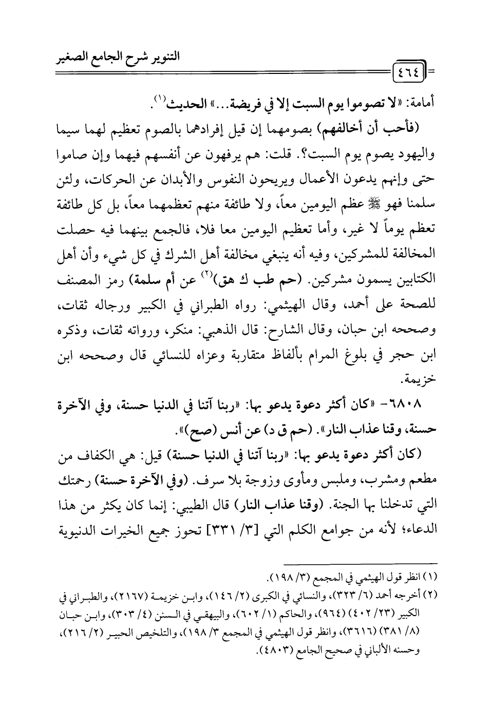 (فأحب أن أخالفهم) بصومهما إن قيل إفرادهما بالصوم تعظيم لهما سيما واليهود يصوم يوم السبت؟. قلت: هم يرفهون عن أنفسهم فيهما وإن صاموا حتى وإنهم يدعون الأعمال ويريحون النفوس والأبدان عن الحركات، ولئن سلمنا فهو - صلى الله عليه وسلم - عظم اليومين معاً، ولا طائفة منهم تعظمهما معاً، بل كل طائفة تعظم يوماً لا غير، وأما تعظيم اليومين معا فلا، فالجمع بينهما فيه حصلت المخالفة للمشركين، وفيه أنه ينبغي مخالفة أهل الشرك في كل شيء وأن أهل الكتابين يسمون مشركين. (حم طب ك هق) (¬2) عن أم سلمة) رمز المصنف للصحة على أحمد، وقال الهيثمي: رواه الطبراني في الكبير ورجاله ثقات، وصححه ابن حبان، وقال الشارح: قال الذهبي: منكر، ورواته ثقات، وذكره ابن حجر في بلوغ المرام بألفاظ متقاربة وعزاه للنسائي قال وصححه ابن خزيمة.