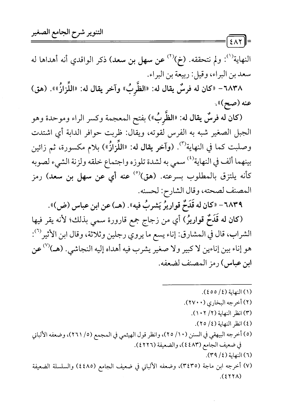 6839 - "كان له قَدَحٌ قواريرُ يَشربُ فيه". (هـ) عن ابن عباس (ض) ".