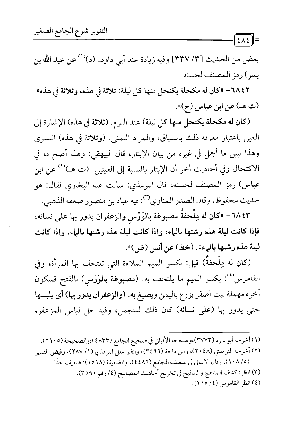 (كان له مكحلة يكتحل منها كل ليلة) عند النوم. (ثلاثة في هذه) الإشارة إلى العين باعتبار معرفة ذلك بالسياق، والمراد اليمنى. (وثلاثة في هذه) اليسرى وهذا يبين ما أجمل في غيره من بيان الإيتار، قال البيهقي: وهذا أصح ما في الاكتحال وفي أحاديث أخر أن الإيتار بالنسبة إلى العينين. (ت هـ) (¬2) عن ابن عباس) رمز المصنف لحسنه، قال الترمذي: سألت عنه البخاري فقال: هو حديث محفوظ، وقال الصدر المناوي (¬3): فيه عباد بن منصور ضعفه الذهبي.