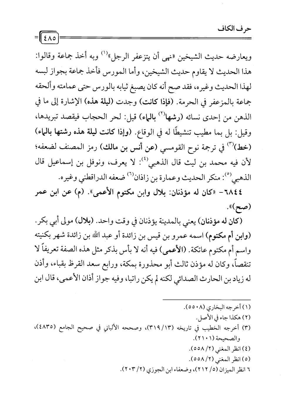 6844 - "كان له مؤذنان: بلال وابن مكتوم الأعمى". (م) عن ابن عمر (صح) ".