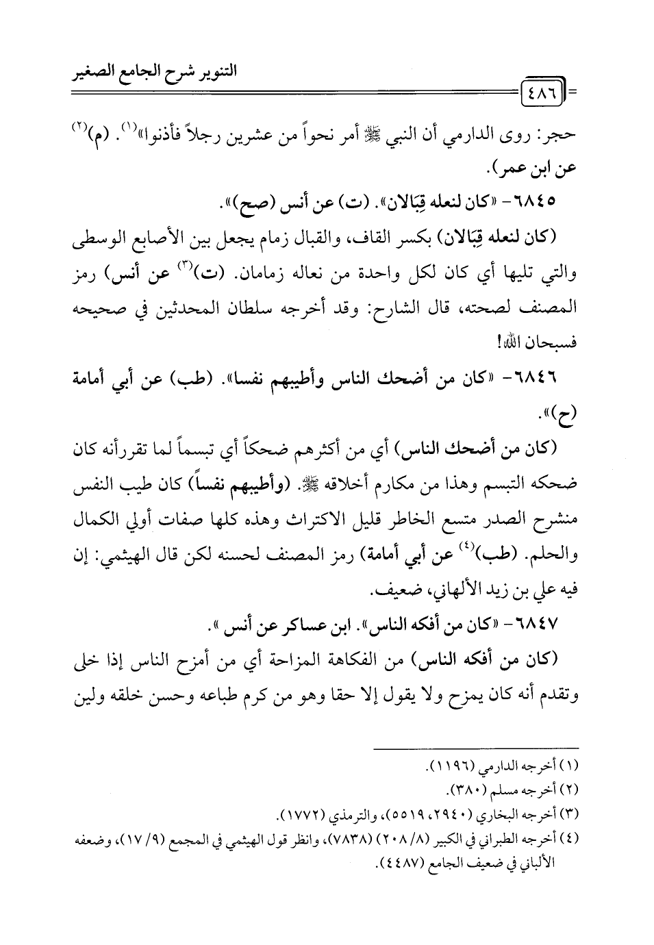 (كان من أضحك الناس) أي من أكثرهم ضحكاً أي تبسماً لما تقرر أنه كان ضحكه التبسم وهذا من مكارم أخلاقه - صلى الله عليه وسلم -. (وأطيبهم نفساً) كان طيب النفس منشرح الصدر متسع الخاطر قليل الاكتراث وهذه كلها صفات أولي الكمال والحلم. (طب) (¬4) عن أبي أمامة) رمز المصنف لحسنه لكن قال الهيثمي: إن فيه علي بن زيد الألهاني، ضعيف.