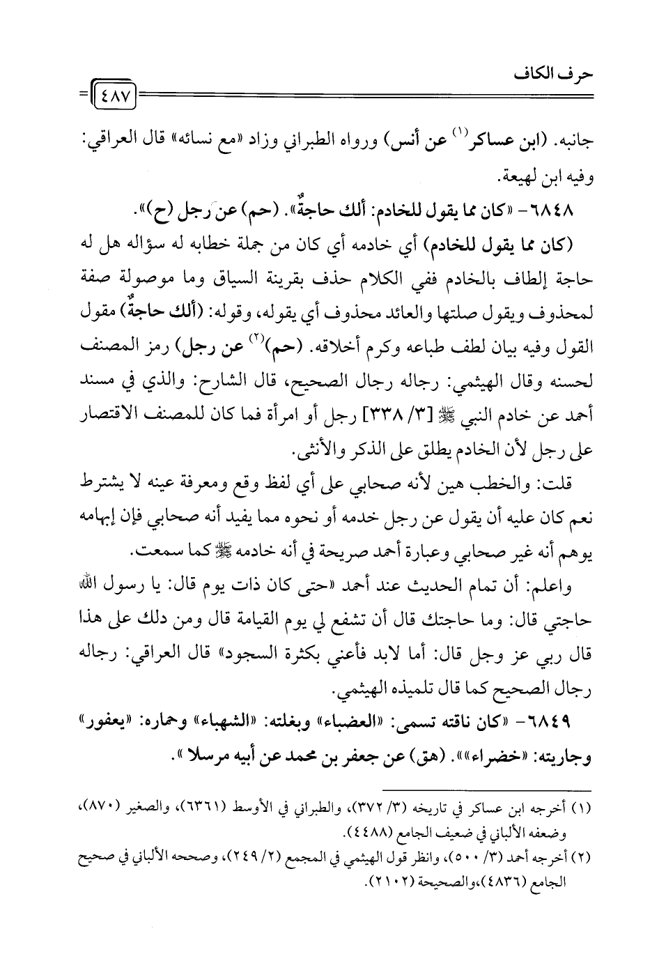 (كان مما يقول للخادم) أي خادمه أي كان من جملة خطابه له سؤاله هل له حاجة إلطاف بالخادم ففي الكلام حذف بقرينة السياق وما موصولة صفة لمحذوف ويقول صلتها والعائد محذوف أي يقوله، وقوله: (ألك حاجةٌ) مقول القول وفيه بيان لطف طباعه وكرم أخلاقه. (حم) (¬2) عن رجل) رمز المصنف لحسنه وقال الهيثمي: رجاله رجال الصحيح، قال الشارح: والذي في مسند أحمد عن خادم النبي - صلى الله عليه وسلم -[3/ 338] رجل أو امرأة فما كان للمصنف الاقتصار على رجل لأن الخادم يطلق على الذكر والأنثى.