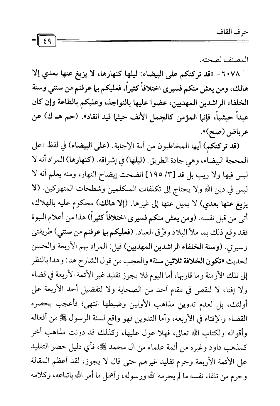 (قد تركتكم) أيها المخاطبون من أمة الإجابة. (على البيضاء) في لفظ "على المحجة البيضاء، وهي جادة الطريق. (ليلها) في إشراقه. (كنهارها) المراد أنه لا لبس فيها ولا ريب بل قد [3/ 195] اتضحت إيضاح النهار، ومنه يعلم أنه لا لبس في دين الله ولا يحتاج إلى تكلفات المتكلمين وشطحات المتهوكين. (لا يزيغ عنها بعدي) لا يميل عنها إلى غيرها. (إلا هالك) محكوم عليه بالهلاك، أتى من قبل نفسه. (ومن يعش منكم فسيرى اختلافاً كثيراً) هذا من أعلام النبوة فقد وقع ذلك بما ملأ البلاد وفرَّق العباد. (فعليكم بما عرفتم من سنتي) طريقتي وسيرتي. (وسنة الخلفاء الراشدين المهديين) قيل: المراد بهم الأربعة والحسن لحديث "تكون الخلافة ثلاثين سنة" والعجب من قول الشارح هنا: وهذا بالنظر إلى تلك الأزمنة وما قاربها، أما اليوم فلا يجوز تقليد غير الأئمة الأربعة في قضاء ولا إفتاء لا لنقص في مقام أحد من الصحابة ولا لتفضيل أحد الأربعة على أولئك، بل لعدم تدوين مذاهب الأولين وضبطها انتهى؛ فأعجب بحصره القضاء والإفتاء في الأربعة، وأما التدوين فهو واقع لسنة الرسول - صلى الله عليه وسلم - من أفعاله وأقواله ولكتاب الله تعالى، فهلا عول عليها، وكذلك قد دونت مذاهب أخر كمذهب داود وغيره من أئمة علماء من آل محمَّد - صلى الله عليه وسلم -، فأي دليل حصر التقليد على الأئمة الأربعة وحرم تقليد غيرهم حتى قال لا يجوز، لقد أعظم المقالة وحرم من تلقاء نفسه ما لم يحرمه الله ورسوله، وأهمل ما أمر الله باتباعه، وكلامه