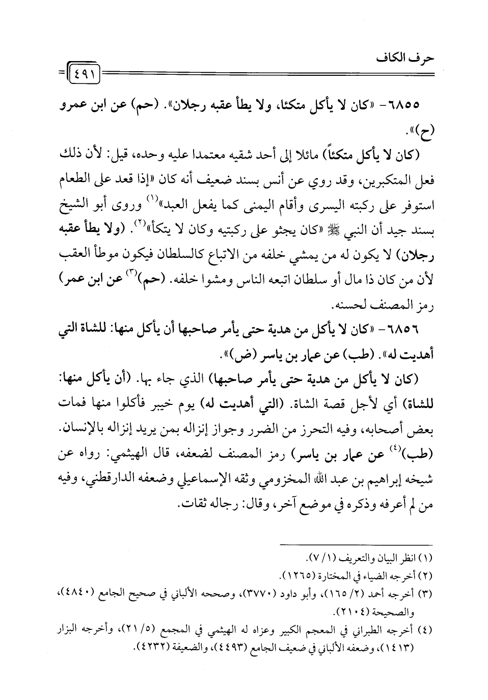 6855 - "كان لا يأكل متكئا، ولا يطأ عقبه رجلان". (حم) عن ابن عمرو (ح) ".