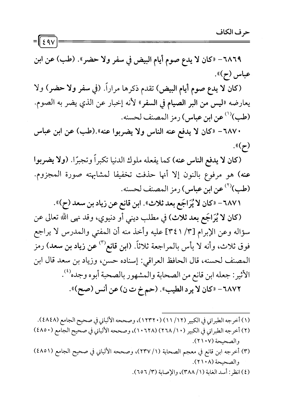 6871 - "كان لا يُرَاجَع بعد ثلاث". ابن قانع عن زياد بن سعد (ح) ".