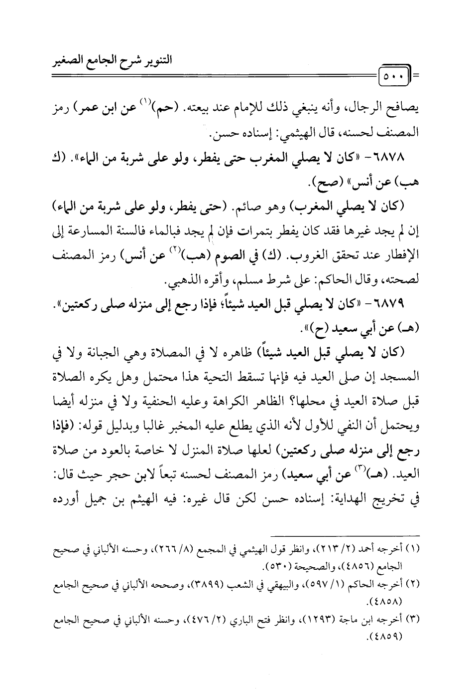 (كان لا يصلي قبل العيد شيئاً) ظاهره لا في المصلاة وهي الجبانة ولا في المسجد إن صلى العيد فيه فإنها تسقط التحية هذا محتمل وهل يكره الصلاة قبل صلاة العيد في محلها؟ الظاهر الكراهة وعليه الحنفية ولا في منزله أيضاً ويحتمل أن النفي للأول لأنه الذي يطلع عليه المخبر غالبا وبدليل قوله: (فإذا رجع إلى منزله صلى ركعتين) لعلها صلاة المنزل لا خاصة بالعود من صلاة العيد. (هـ) (¬3) عن أبي سعيد) رمز المصنف لحسنه تبعاً لابن حجر حيث قال: في تخريج الهداية: إسناده حسن لكن قال غيره: فيه الهيثم بن جميل أورده