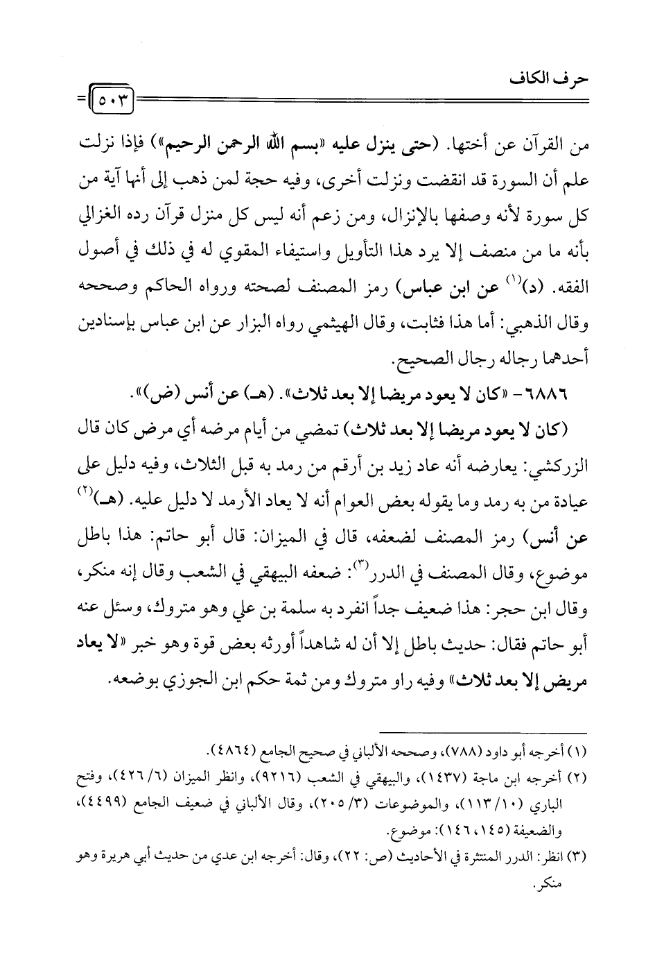 6886 - "كان لا يعود مريضا إلا بعد ثلاث". (هـ) عن أنس (ض) ".