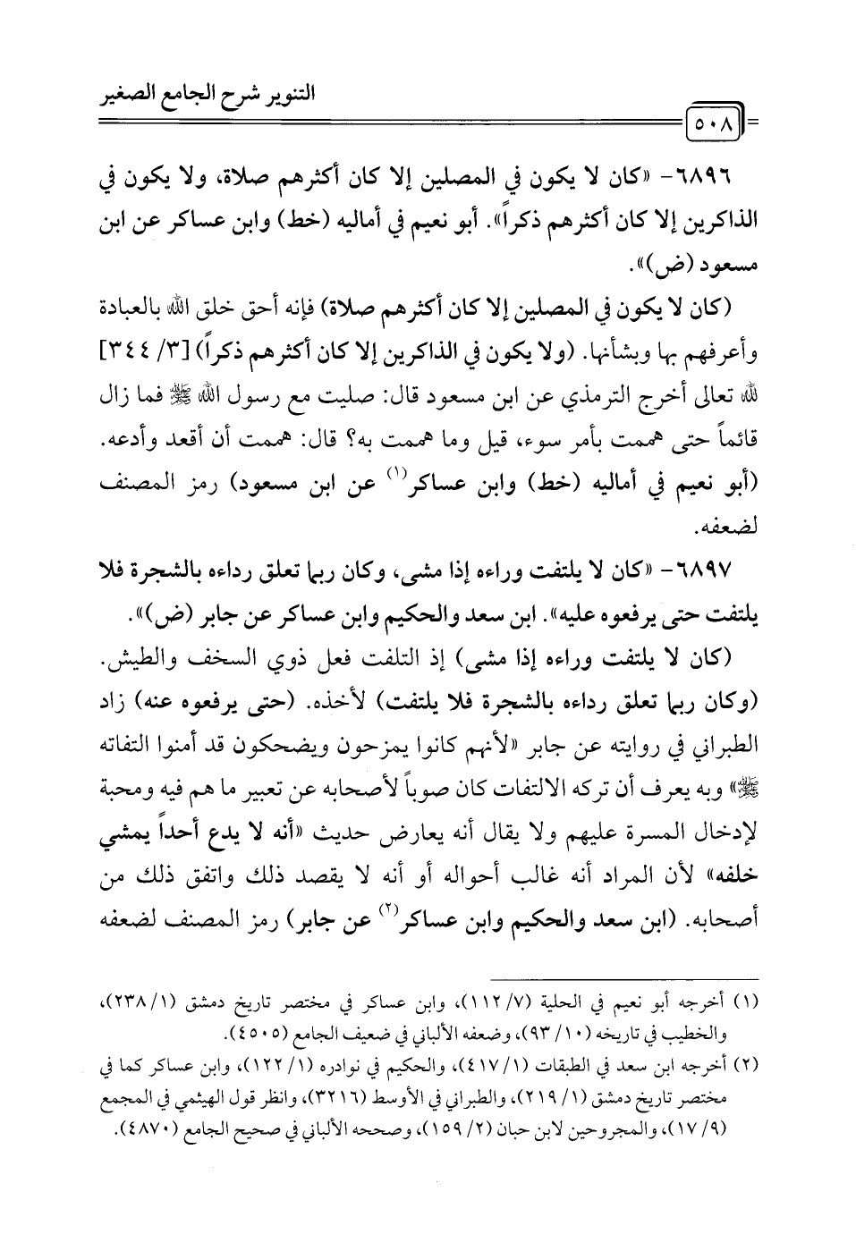 6897 - "كان لا يلتفت وراءه إذا مشى، وكان ربما تعلق رداءه بالشجرة فلا يلتفت حتى يرفعوه عليه". ابن سعد والحكيم وابن عساكر عن جابر (ض) ".