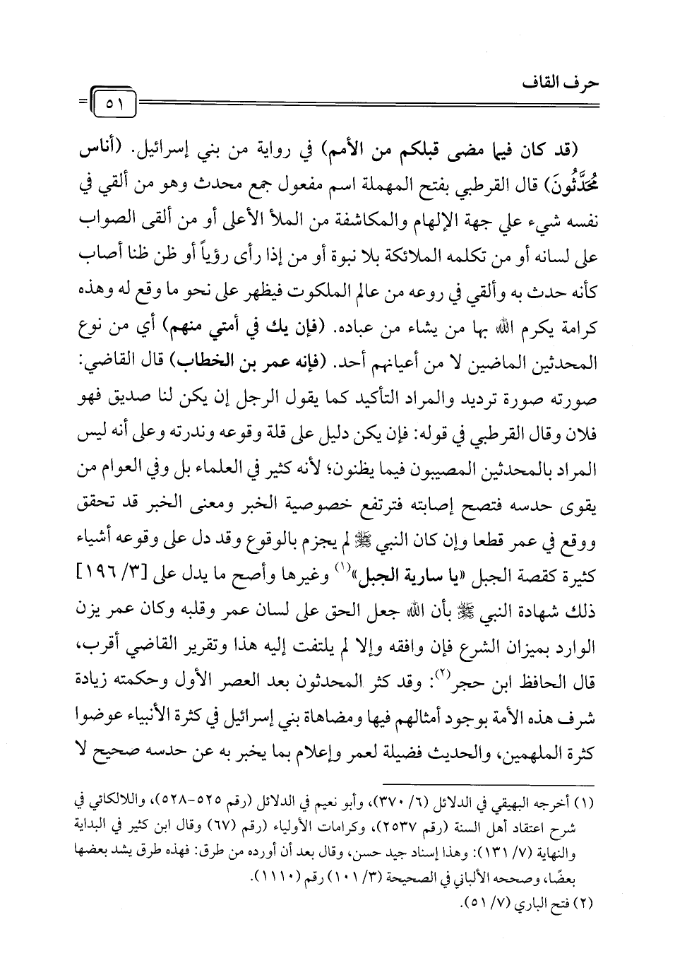 (قد كان فيما مضى قبلكم من الأمم) في رواية من بني إسرائيل. (أناس مُحَدَّثُونَ) قال القرطبي بفتح المهملة اسم مفعول جمع محدث وهو من ألقي في نفسه شيء علي جهة الإلهام والمكاشفة من الملأ الأعلى أو من ألقى الصواب على لسانه أو من تكلمه الملائكة بلا نبوة أو من إذا رأى رؤياً أو ظن ظنا أصاب كأنه حدث به وألقي في روعه من عالم الملكوت فيظهر على نحو ما وقع له وهذه كرامة يكرم الله بها من يشاء من عباده. (فإن يك في أمتي منهم) أي من نوع المحدثين الماضين لا من أعيانهم أحد. (فإنه عمر بن الخطاب) قال القاضي: صورته صورة ترديد والمراد التأكيد كما يقول الرجل إن يكن لنا صديق فهو فلان وقال القرطبي في قوله: فإن يكن دليل على قلة وقوعه وندرته وعلى أنه ليس المراد بالمحدثين المصيبون فيما يظنون؛ لأنه كثير في العلماء بل وفي العوام من يقوى حدسه فتصح إصابته فترتفع خصوصية الخبر ومعنى الخبر قد تحقق ووقع في عمر قطعا وإن كان النبي - صلى الله عليه وسلم - لم يجزم بالوقوع وقد دل على وقوعه أشياء كثيرة كقصة الجبل "يا سارية الجبل" (¬1) وغيرها وأصح ما يدل على [3/ 196] ذلك شهادة النبي - صلى الله عليه وسلم - بأن الله جعل الحق على لسان عمر وقلبه وكان عمر يزن الوارد بميزان الشرع فإن وافقه وإلا لم يلتفت إليه هذا وتقرير القاضي أقرب، قال الحافظ ابن حجر (¬2): وقد كثر المحدثون بعد العصر الأول وحكمته زيادة شرف هذه الأمة بوجود أمثالهم فيها ومضاهاة بني إسرائيل في كثرة الأنبياء عوضوا كثرة الملهمين، والحديث فضيلة لعمر وإعلام بما يخبر به عن حدسه صحيح لا