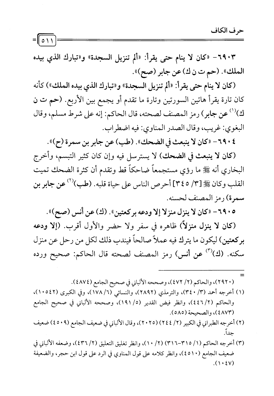 6903 - "كان لا ينام حتى يقرأ: "ألم تنزيل السجدة" و"تبارك الذي بيده الملك". (حم ت ن ك) عن جابر (صح) ".