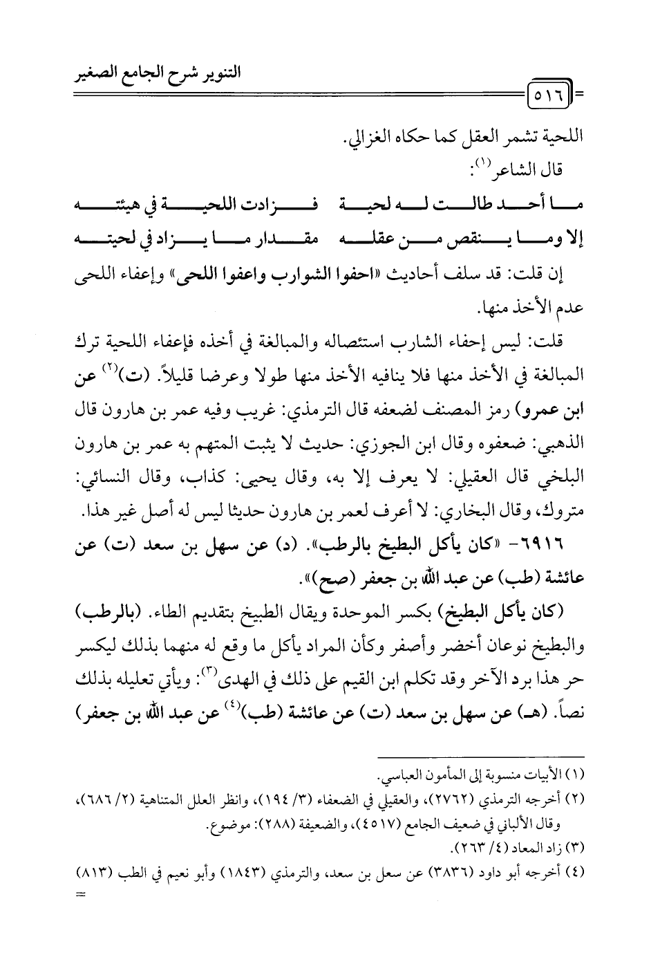 قلت: ليس إحفاء الشارب استئصاله والمبالغة في أخذه فإعفاء اللحية ترك المبالغة في الأخذ منها فلا ينافيه الأخذ منها طولا وعرضا قليلاً. (ت) (¬2) عن ابن عمرو) رمز المصنف لضعفه قال الترمذي: غريب وفيه عمر بن هارون قال الذهبي: ضعفوه وقال ابن الجوزي: حديث لا يثبت المتهم به عمر بن هارون البلخي قال العقيلي: لا يعرف إلا به، وقال يحيى: كذاب، وقال النسائي: متروك، وقال البخاري: لا أعرف لعمر بن هارون حديثا ليس له أصل غير هذا.