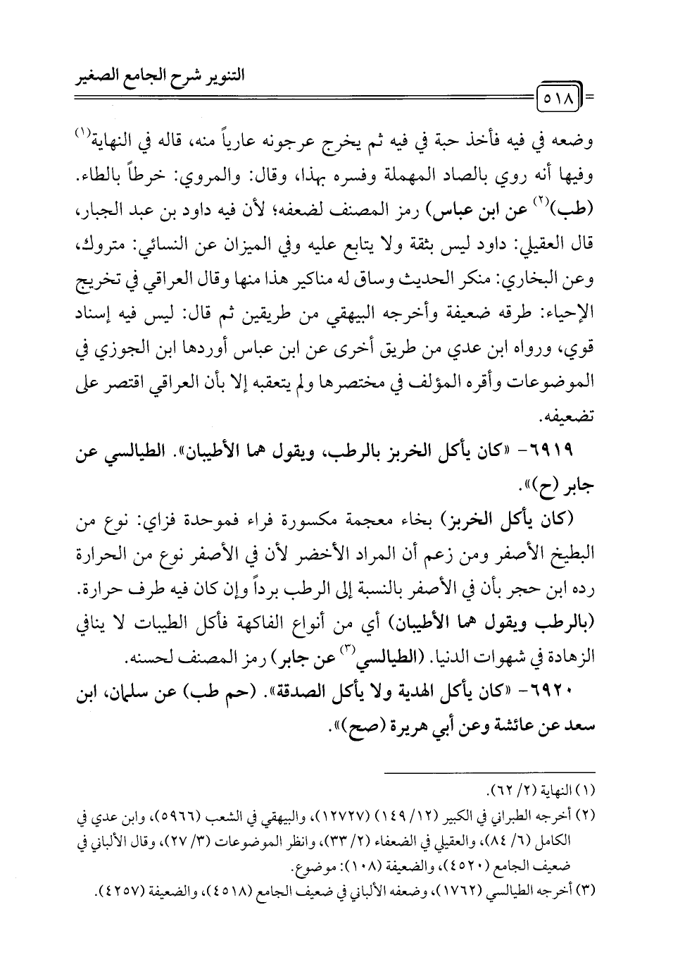 6919 - "كان يأكل الخربز بالرطب، ويقول هما الأطيبان". الطيالسي عن جابر (ح) ".