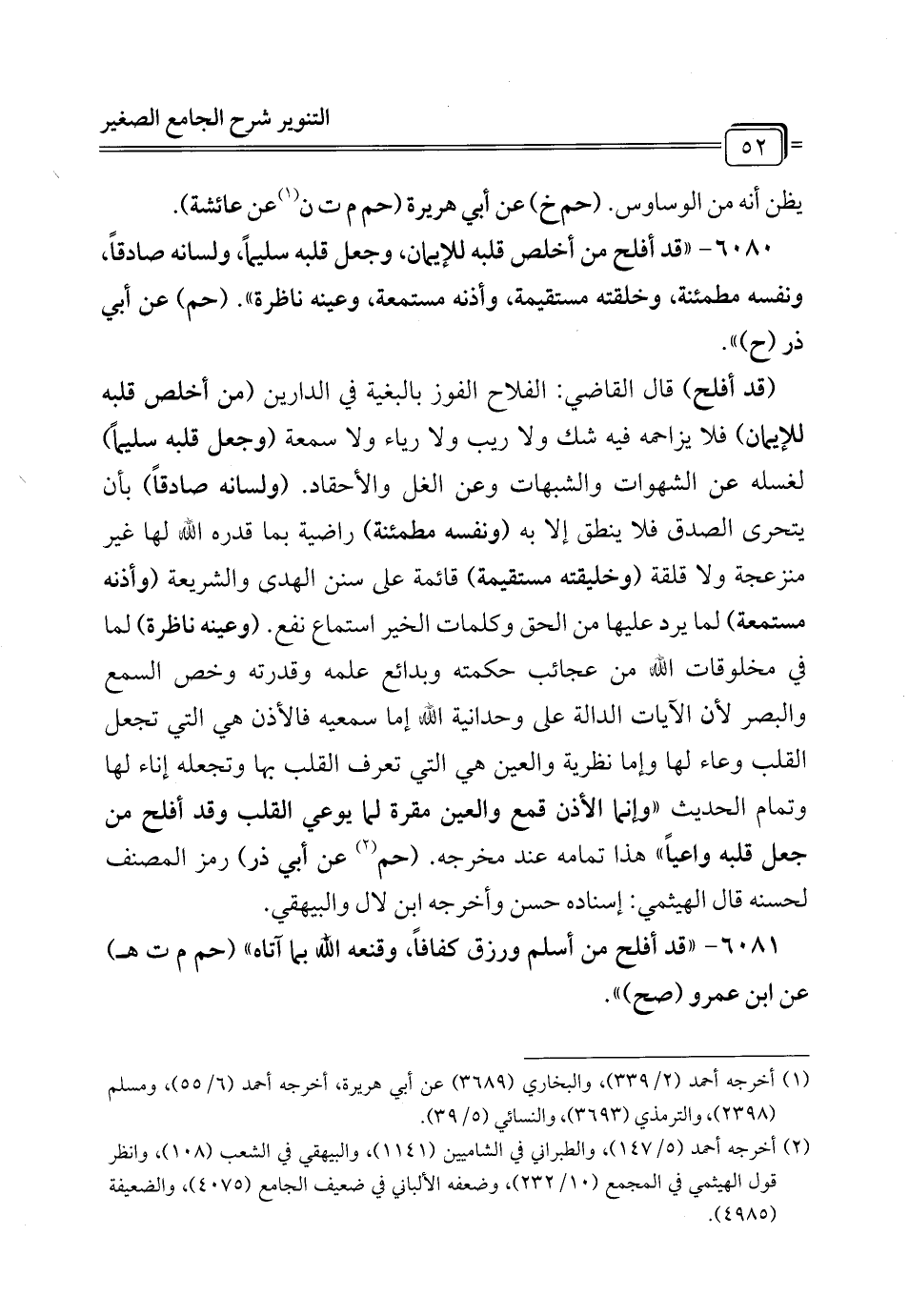 6080 - "قد أفلح من أخلص قلبه للإيمان، وجعل قلبه سليماً، ولسانه صادقاً، ونفسه مطمئنة، وخلقته مستقيمة، وأذنه مستمعة، وعينه ناظرة". (حم) عن أبي ذر (ح) ".