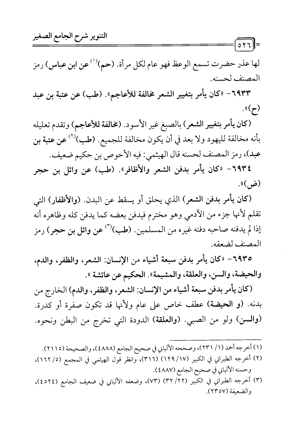 6933 - "كان يأمر بتغيير الشعر مخالفة للأعاجم". (طب) عن عتبة بن عبد (ح) ".