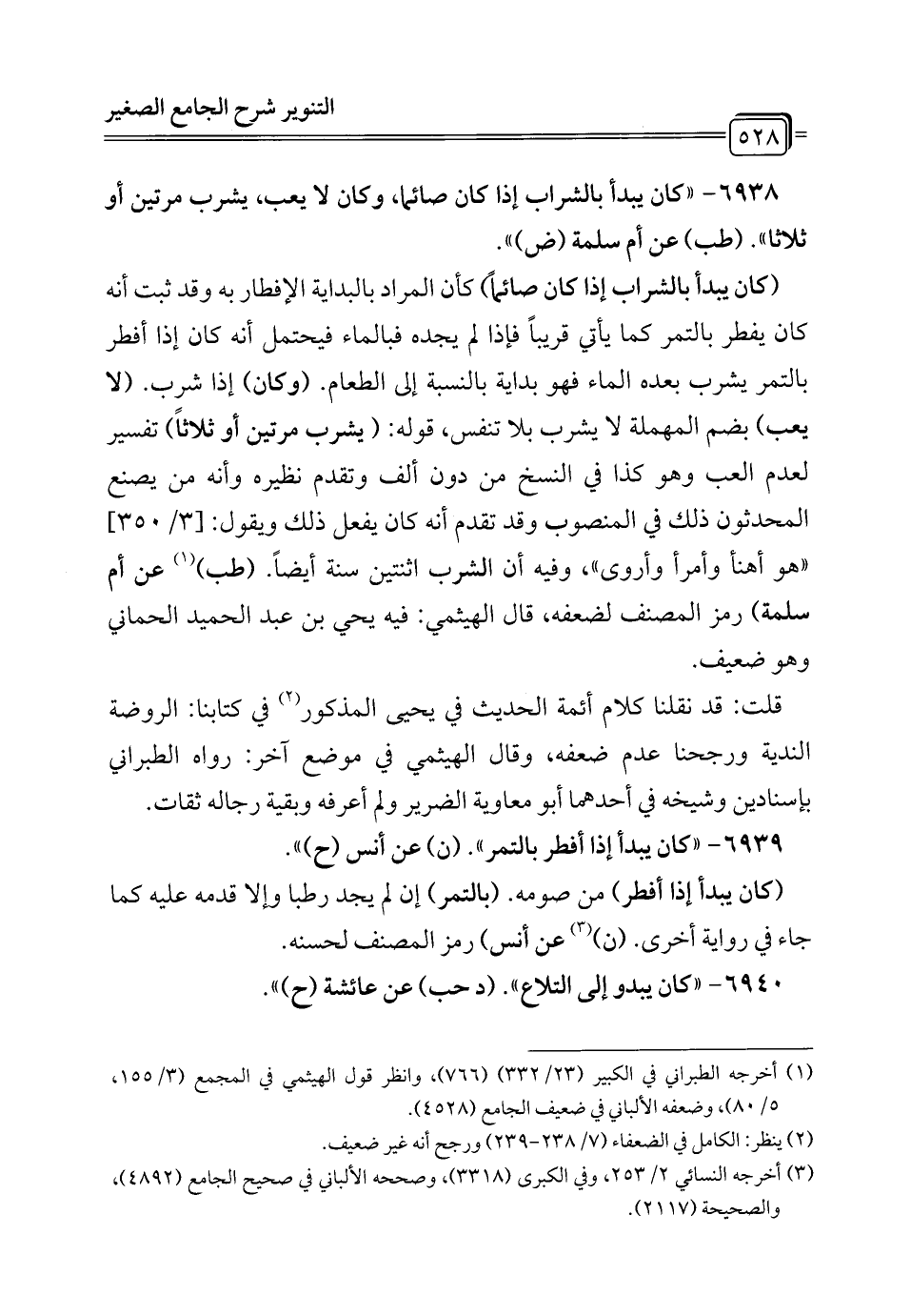 6938 - "كان يبدأ بالشراب إذا كان صائما، وكان لا يعب، يشرب مرتين أو ثلاثا". (طب) عن أم سلمة (ض) ".